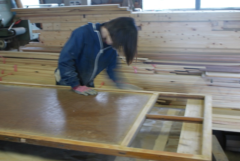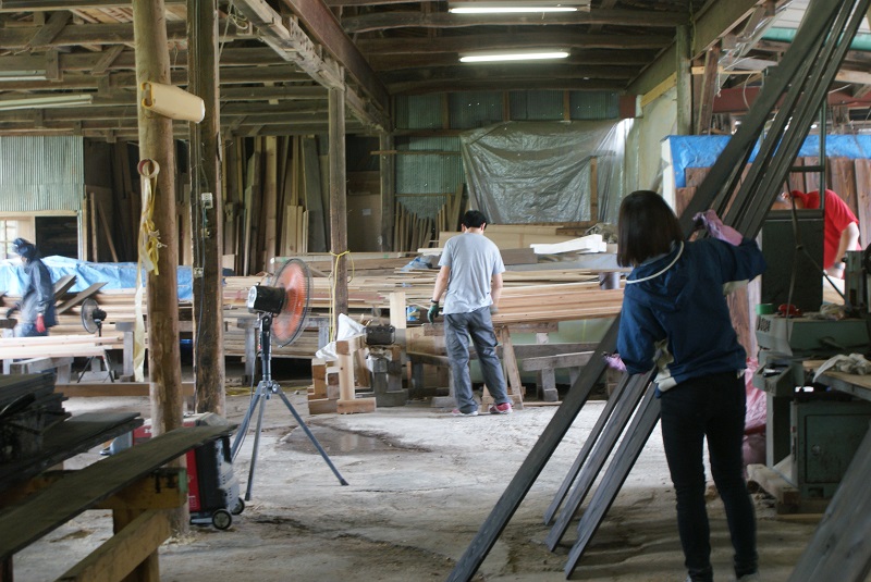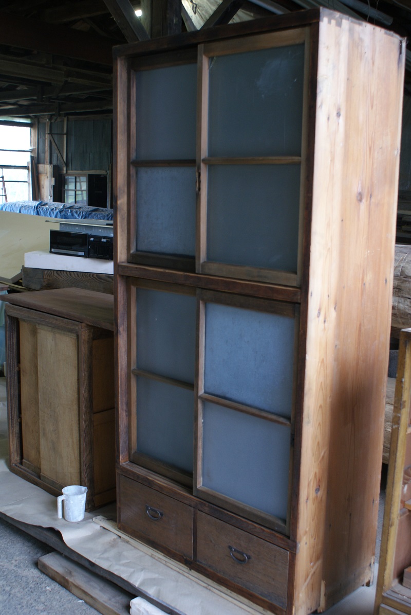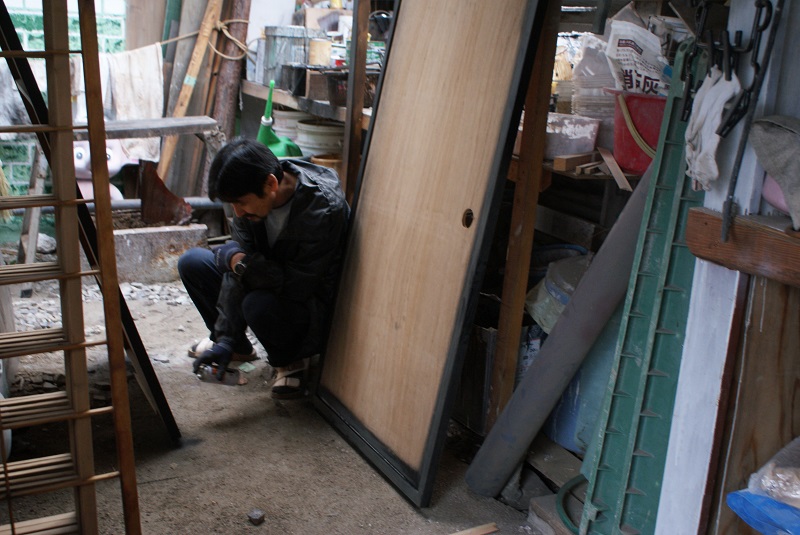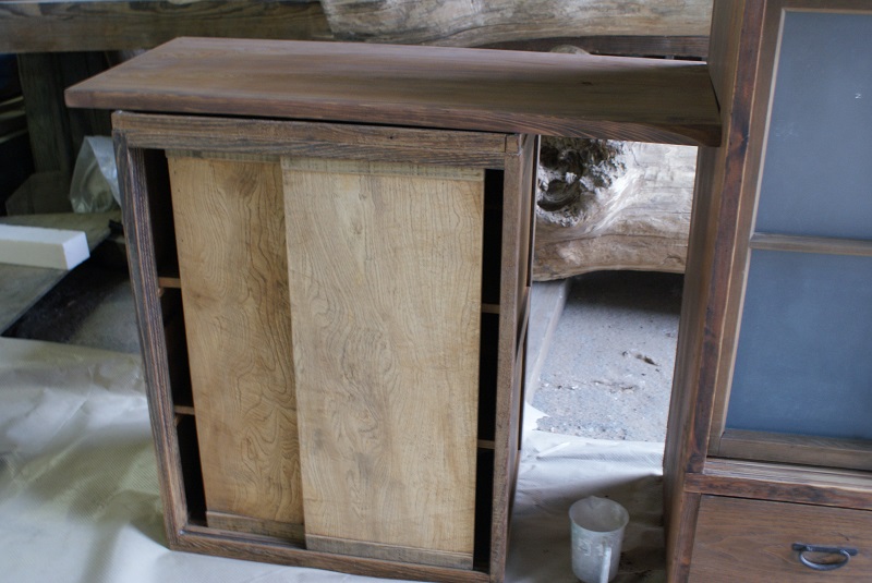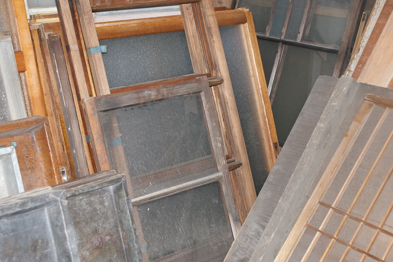 古民家の改修工事の際に外した家具を再生しています。無くなっている扉を古材の中から合うサイズのものを探して取り付けてみたり、幅を詰めてみたりと、創意工夫の成果で味のある下足収納が出来てきました。その脇では、建具の再生にも取り組んでいます。