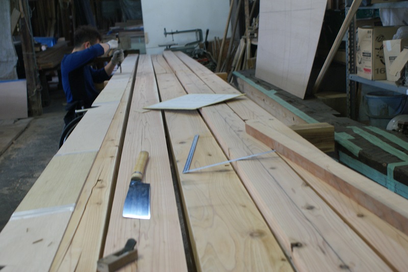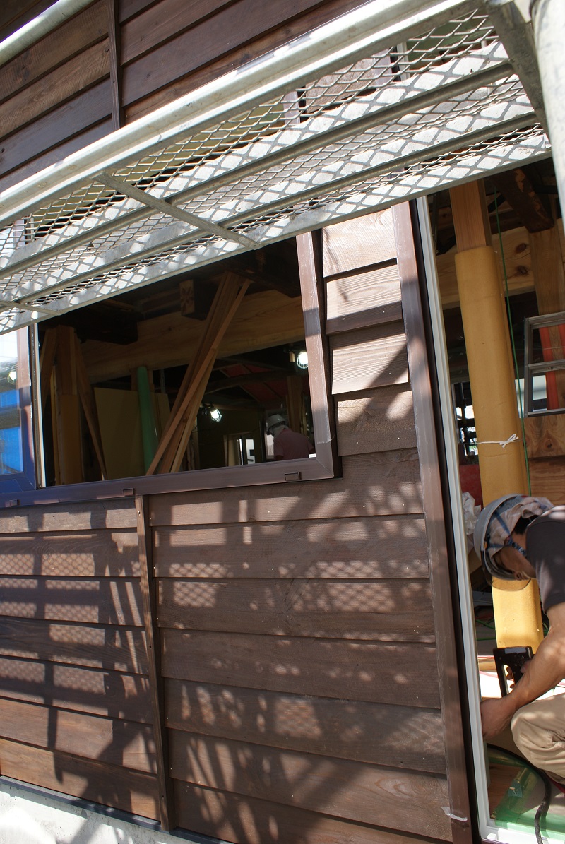 下見板張り外壁のささらごを造っているところです。作り手は建具職さんなのですが、普段から無垢の木を扱う職人にとっては仕事を選ぶことは無く、無垢材の扱いに関しては何でもこうして熟せる多能職としての広がりを自然の木なら引き出してくれる様に思います。なればこそ、近場の山に感謝です。