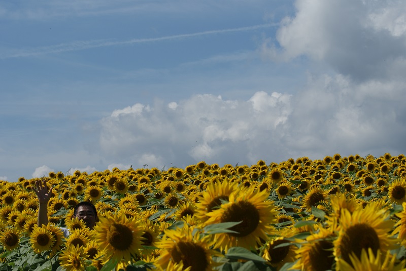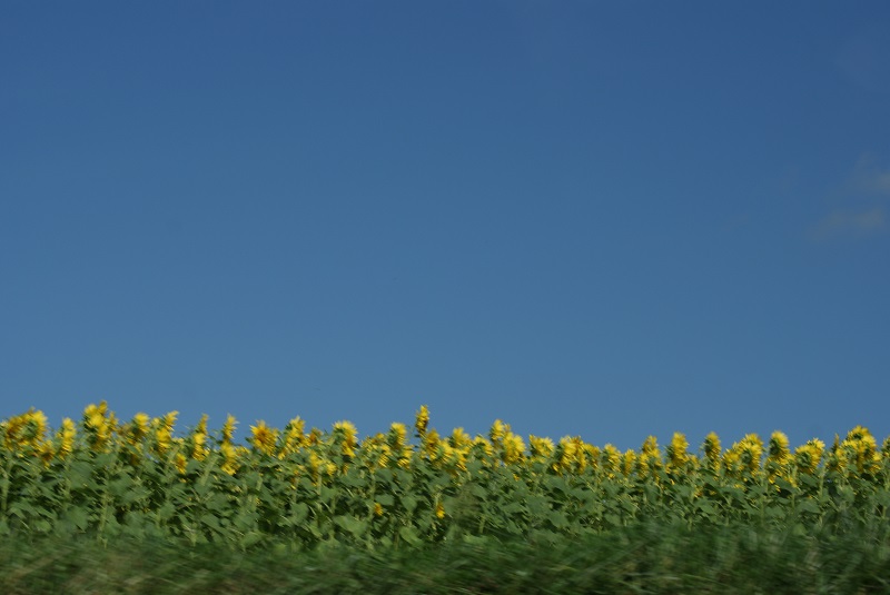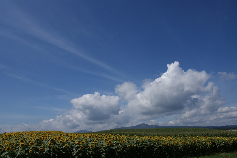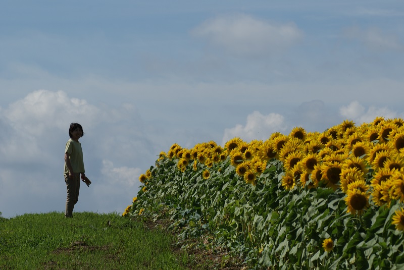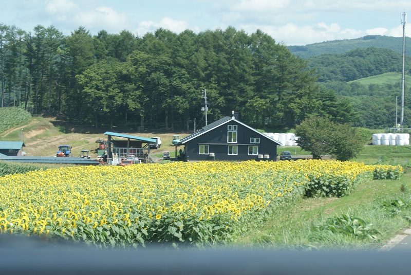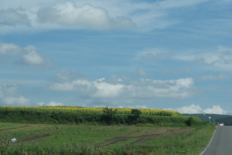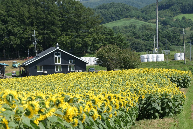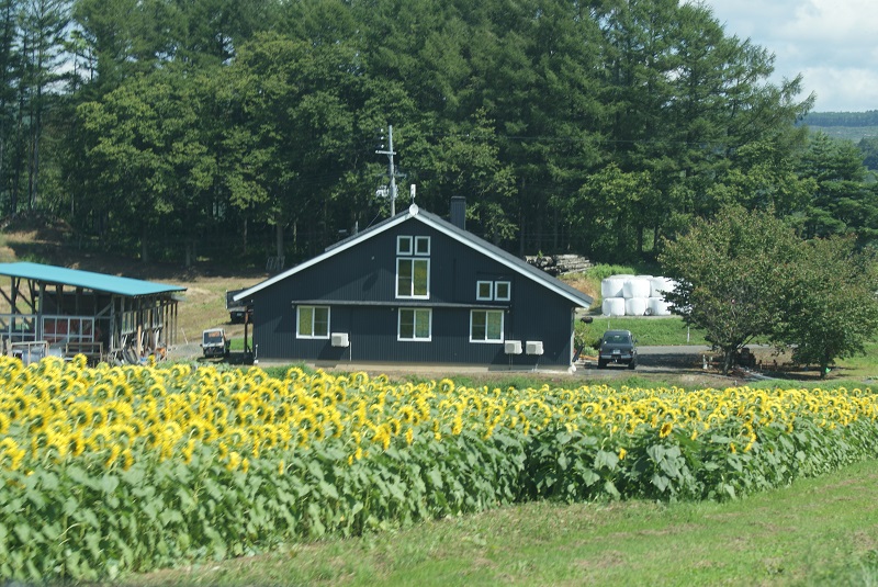 5年前に大改修工事リノベーションさせていただいた、一戸町奥中山のお住まいを訪ねました。国道4号線を北上し、北上川源流公園の看板を目印に右折して、北上川源流公園を右手に見ながら山道を登り大きな農道に出たところで、また右折して目的に向かうと、農地と空の境目が黄色い筋に見えて来ました。そして、道路の左側一面の向日葵畑に圧倒されました。しかも、目指す先のお住まいは、その向日葵畑の中に佇んでいる様に見えたのです。県内では、矢巾の向日葵畑が有名ですが、ここ奥中山にもそれに匹敵する素晴らしい景色があります。今が見頃ですから、是非見に行かれることをお勧めいたします。ポイントは空と繋がる様な向日葵畑の風景と、その空の雄大さです。雲の向こうには奥中山高原も望めます。地域の気さくな農家さんとの会話も、心安らぐ良い時間になると思います。とても優しい笑顔の素敵な人たちが向日葵の様にニコニコしていますよ。