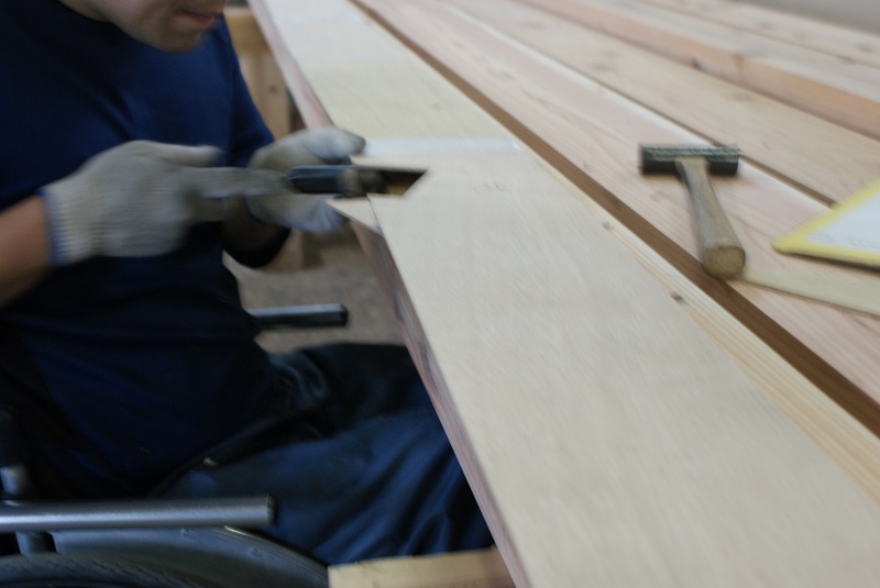 9月25日の日記で登り梁の型造りをしているところをご紹介しましたが、その型を使い墨を付けているところです。車椅子にブレーキをかけて確りと固定して、鑿を使う姿は間違いなく大工の姿そのものです。今の時代、本物の木に墨を付けた事のない大工さんも居ると思われますが、大和田洋平はこうしてそれをしているのです。また先日は、滝沢市のイベントに参加して、地域の子供たちに車椅子バスケを教えたりとボランティア活動にも一生懸命です。この姿を見ていると心から応援したくなります。頑張れ洋平!