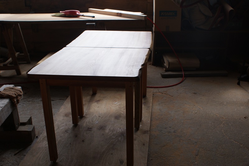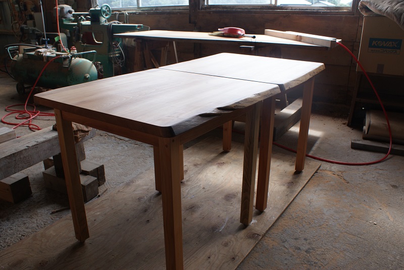 桂の一枚板のテーブルが出来ました。2台並べると一枚の板に見える様になります。しかも、足も桂の木なので、オール桂のテーブルです。蜜蝋ワックス仕上げです。