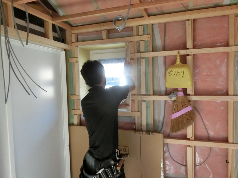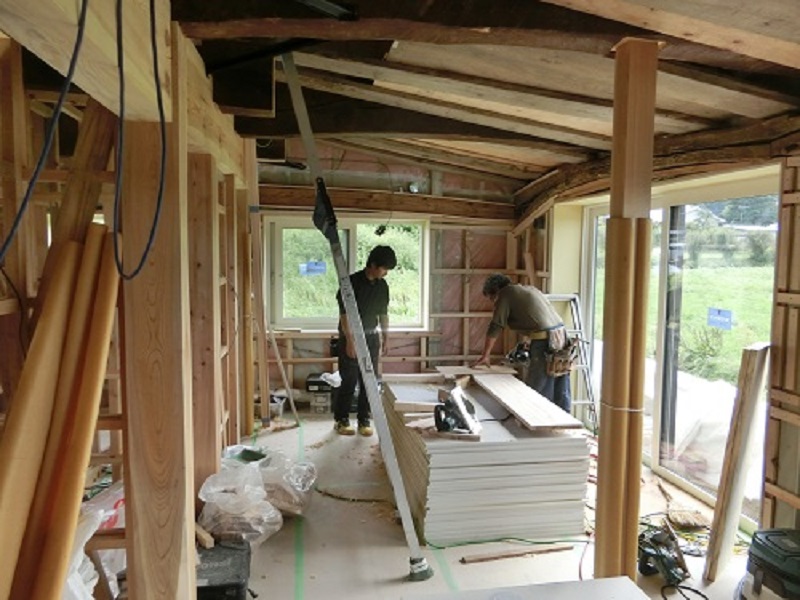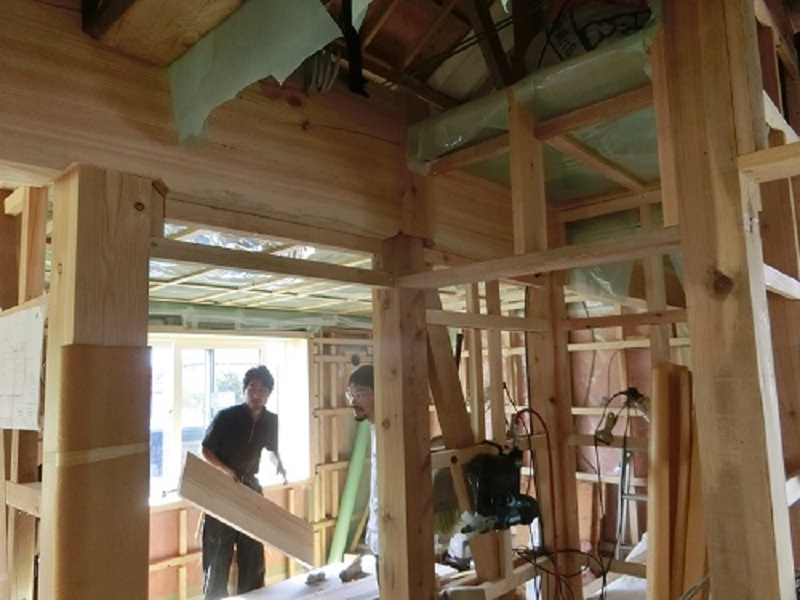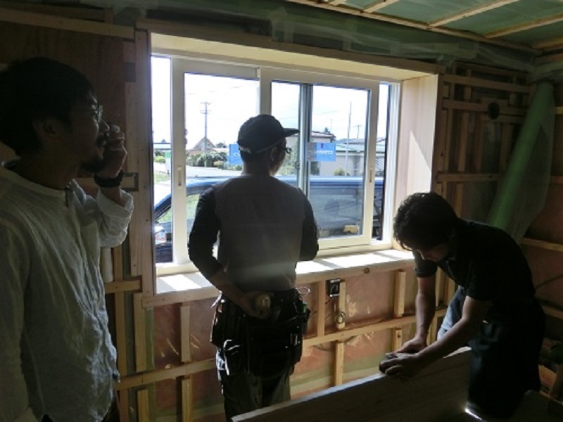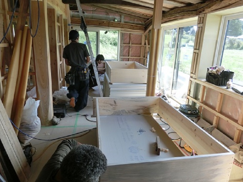杢創舎大工塾は刻みばかりではありません。造作仕事と云いますが、無垢材の枠を現場で実際に取り付ける仕事を若手大工が先輩の指導の下行いました。今日の写真はその風景です。