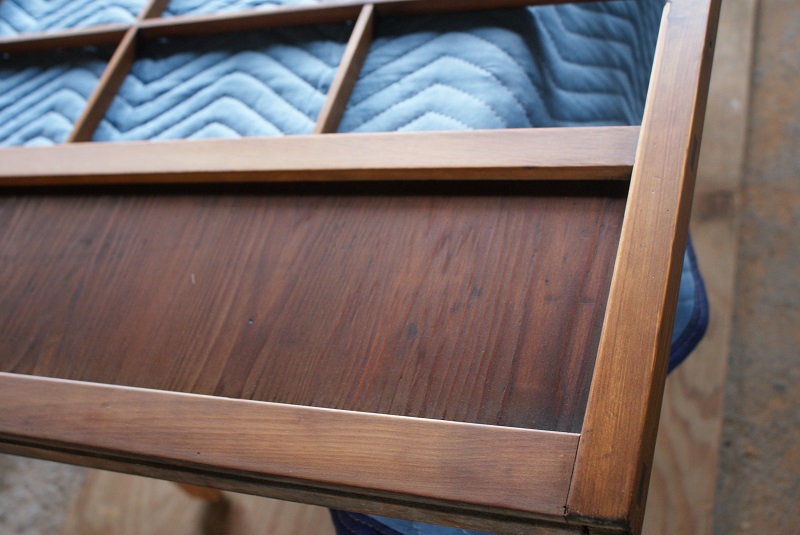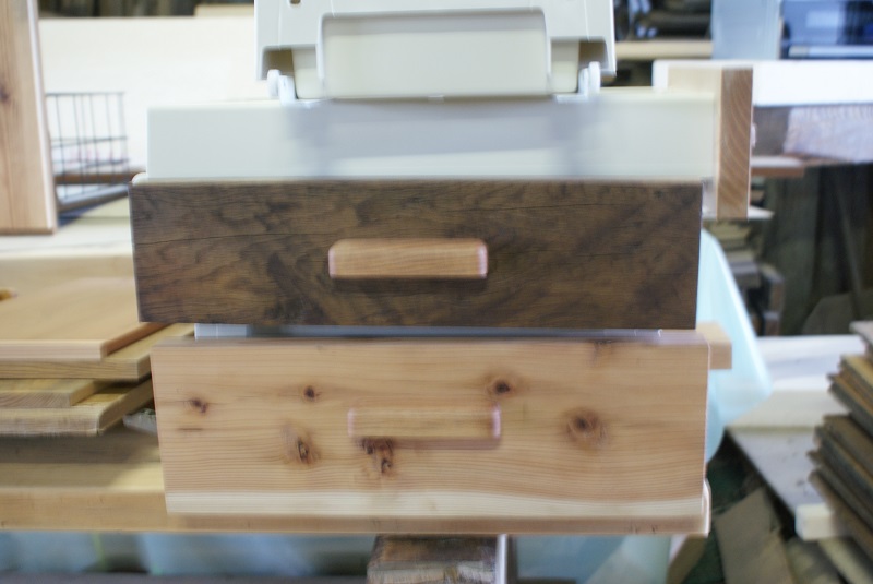 システムキッチンの引き出しを再生再利用します。塩ビシートを張り込んだ引き出し面材を取り外して、古材の板に取り替えましたが、これらもオイルでレトロ感ある仕上がりになる予定です。