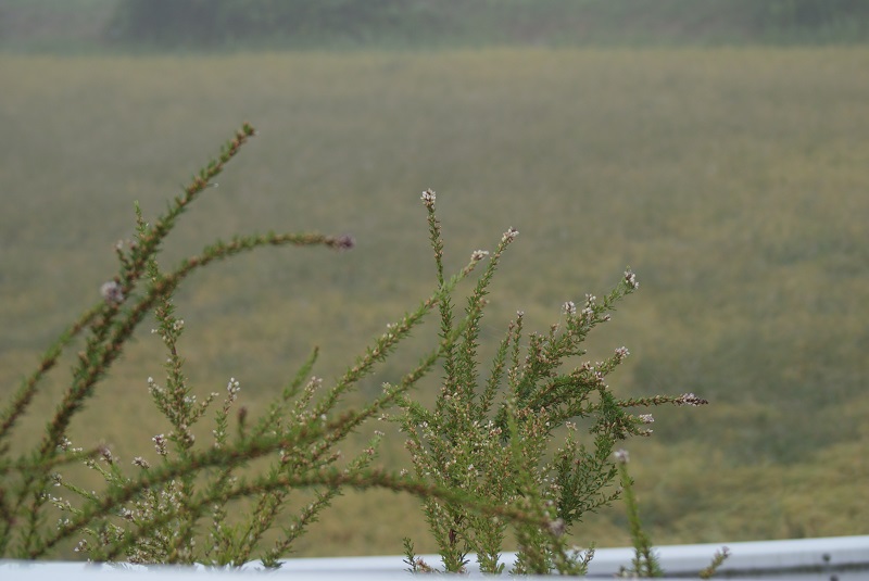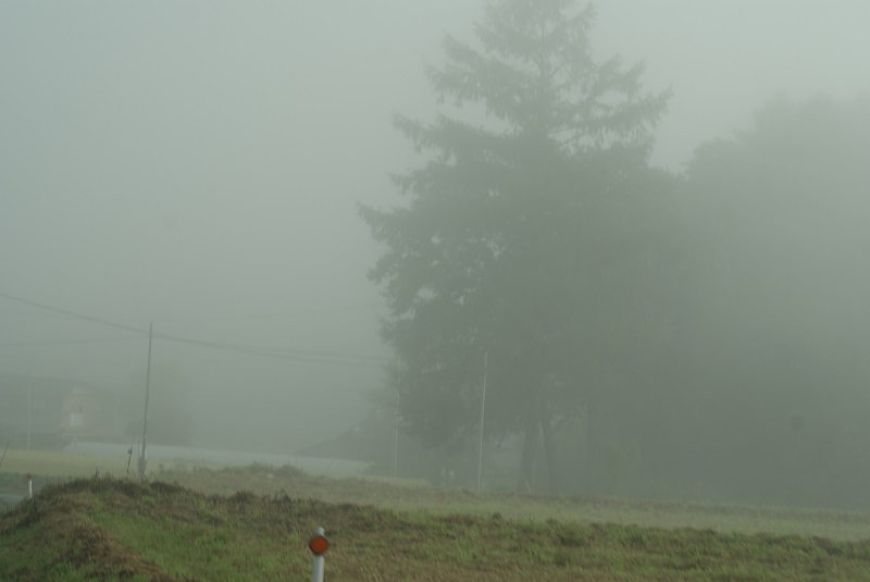 今朝の通勤路は濃霧でした。万葉の時代から秋は霧、秋の季語との事ですから、日本にはなじみ深い今朝の通勤路の秋霧でした。ところが、道端の杉に花が見えて、春でもなしに花粉舞うのかなぁ~と、驚きました。霧の中に小さな杉の枝が花と共に揺れる姿のこの風情は絵にはなりますが、花粉症の皆様には油断できない秋なのに暖かさです。霧の朝は晴れると昔から言いますね。