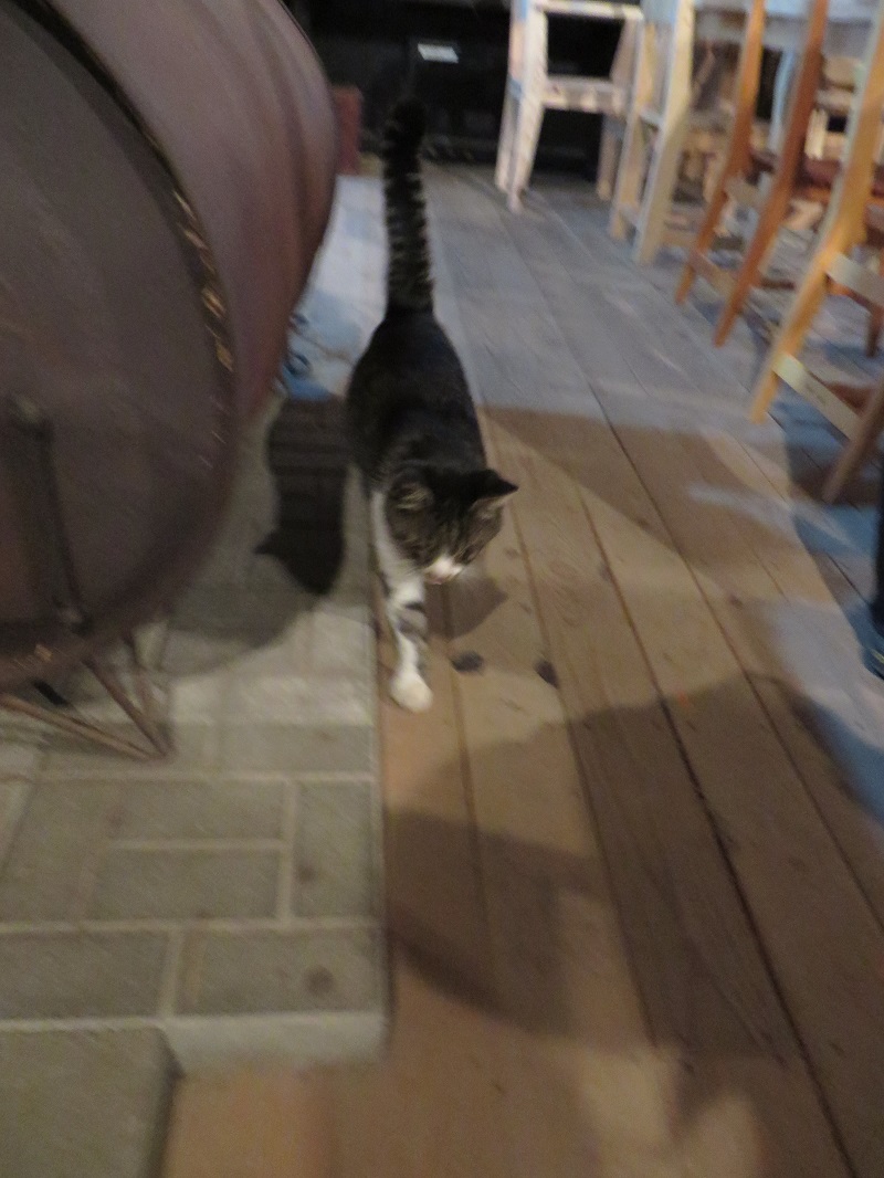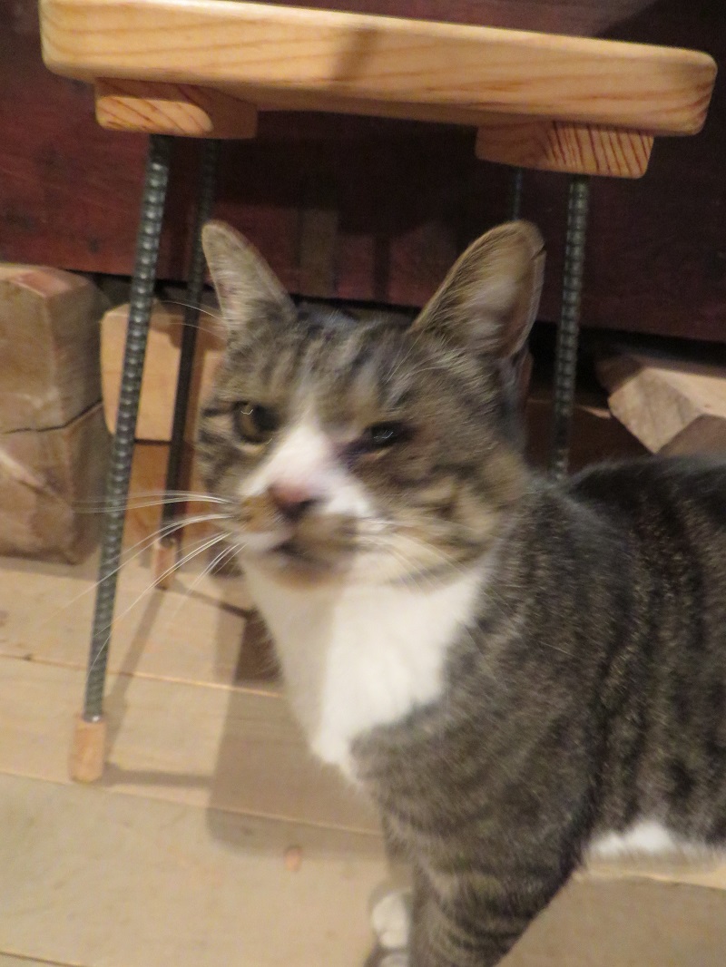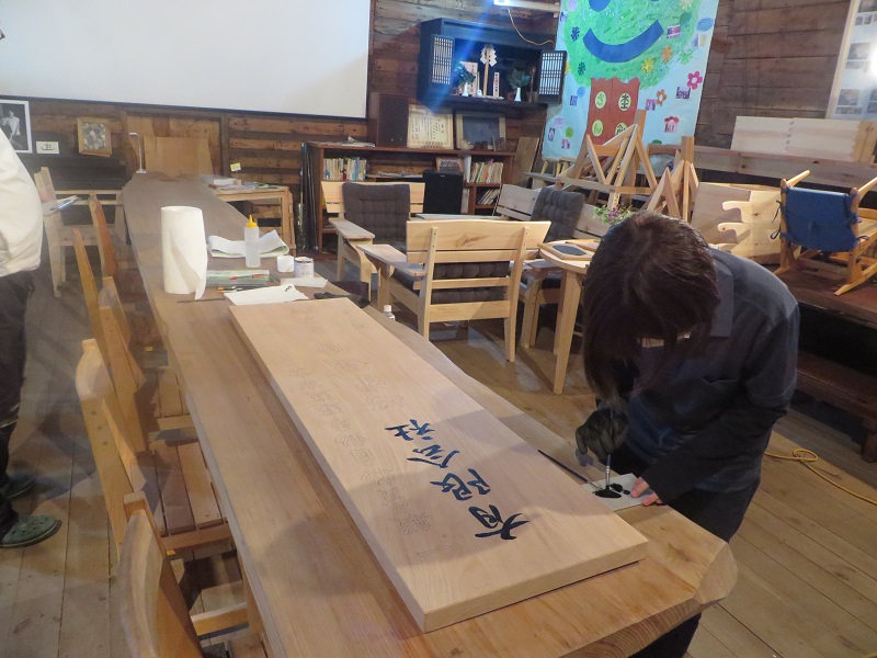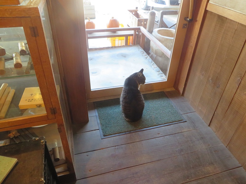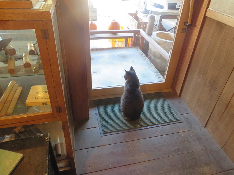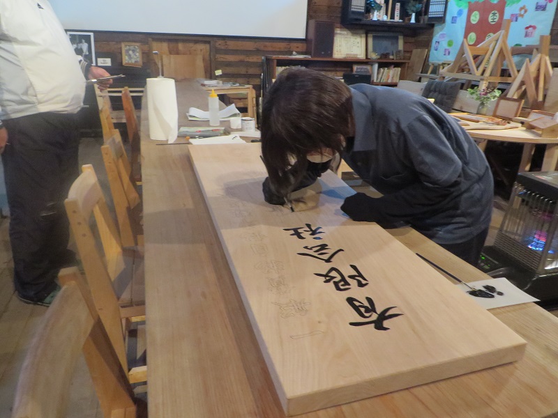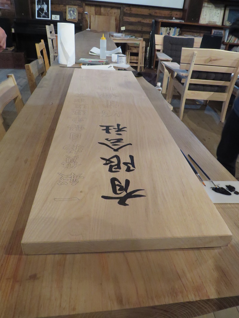 通り掛かりの方が木のお店にお立ち寄りになられて、看板のご依頼を頂きました。幅385mmで長さ1400mmの栗板を加工して、写真は、春入社の鈴木が文字を書いているところです。一昨日無事完成しました。その作業を猫が見守っていました・・・笑。同じ板がもう一枚あります。