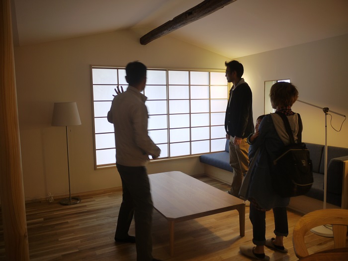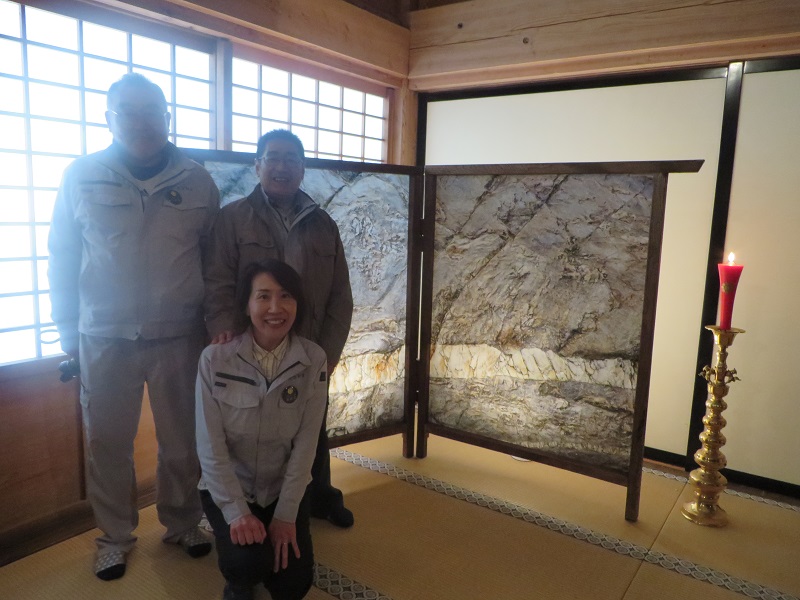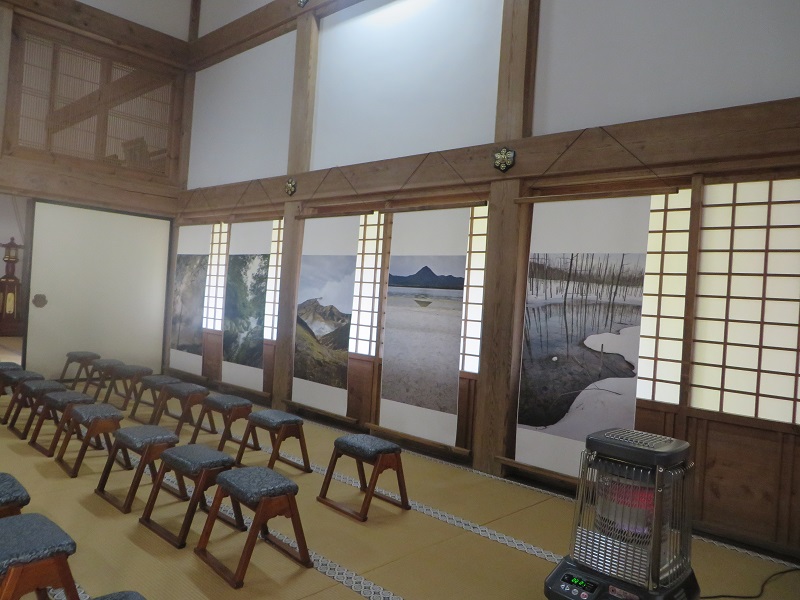 アーティストは、能(宝生流)澤田宏司さん、尺八のラルフ・サミュエルソンさん、フォトグラファーのマグダレナ・ソレさん。「地水火風」という創作能の背景に、マグダレナ・ソレさんの撮影した美しい東北の風景が映し出されましたが、マグダレナ・ソレさんが大伸ばしした写真にを屏風や掛け軸を製作した作品を展示したのですが、当社ではその屏風と掛け熟軸の木組を創作致しました。
