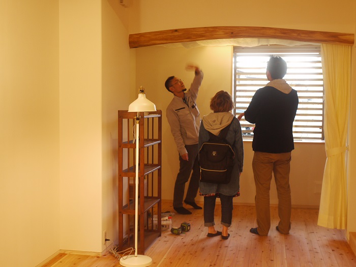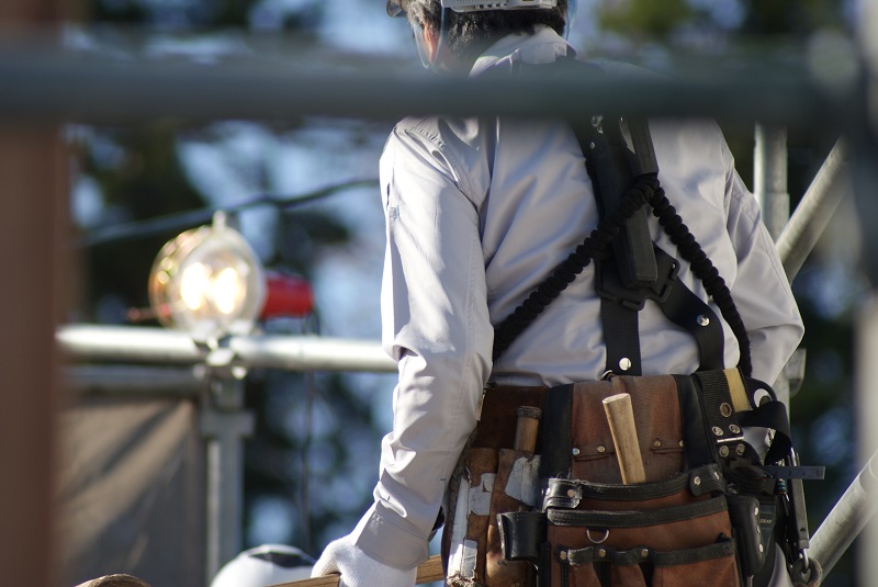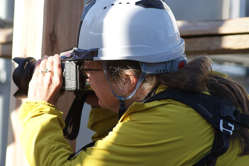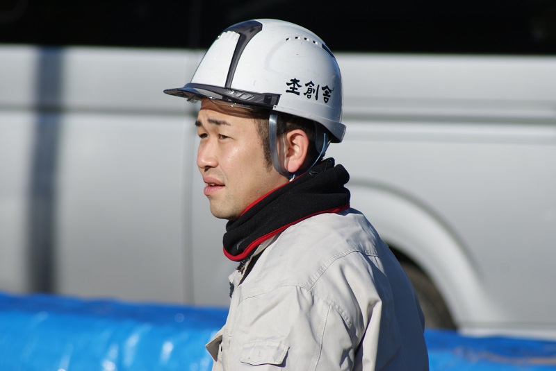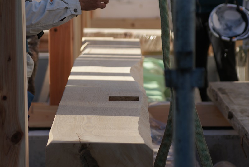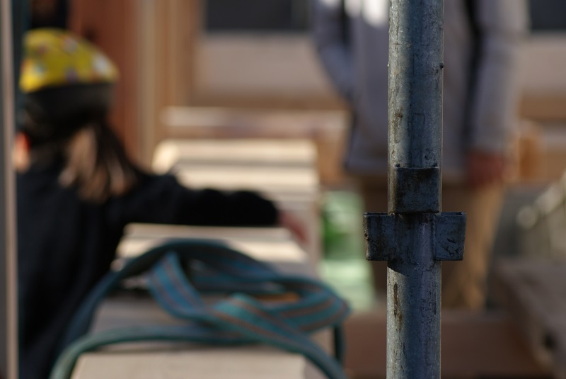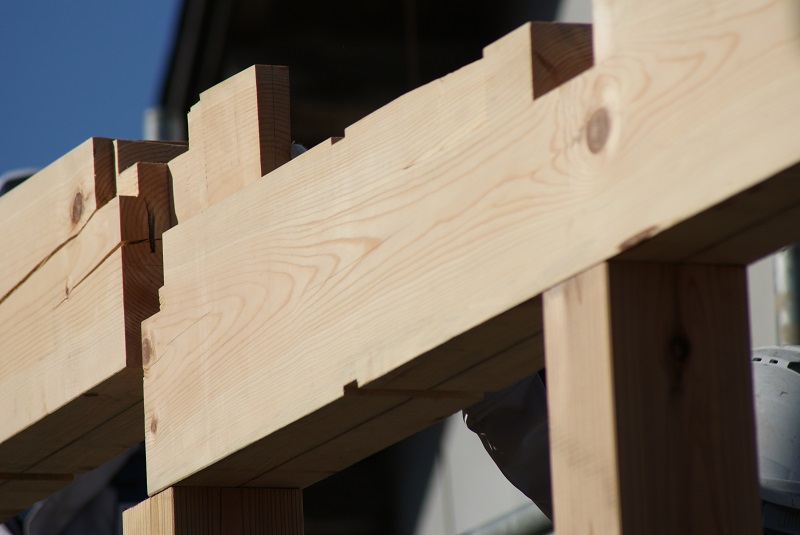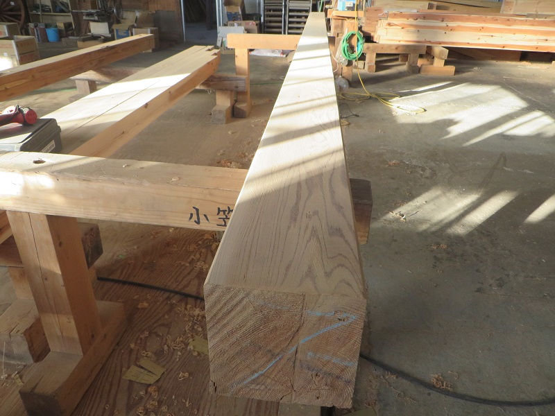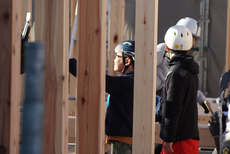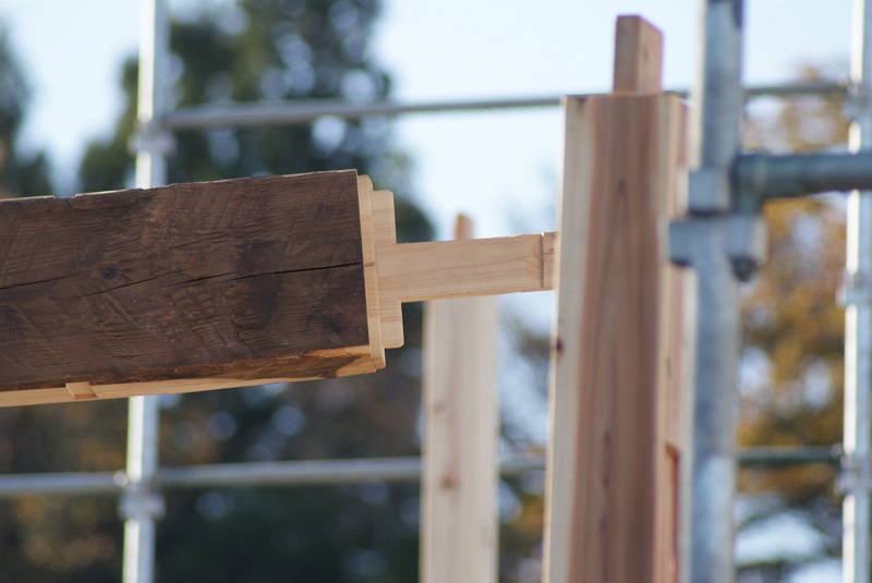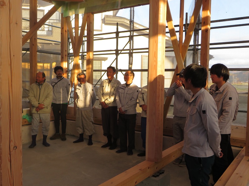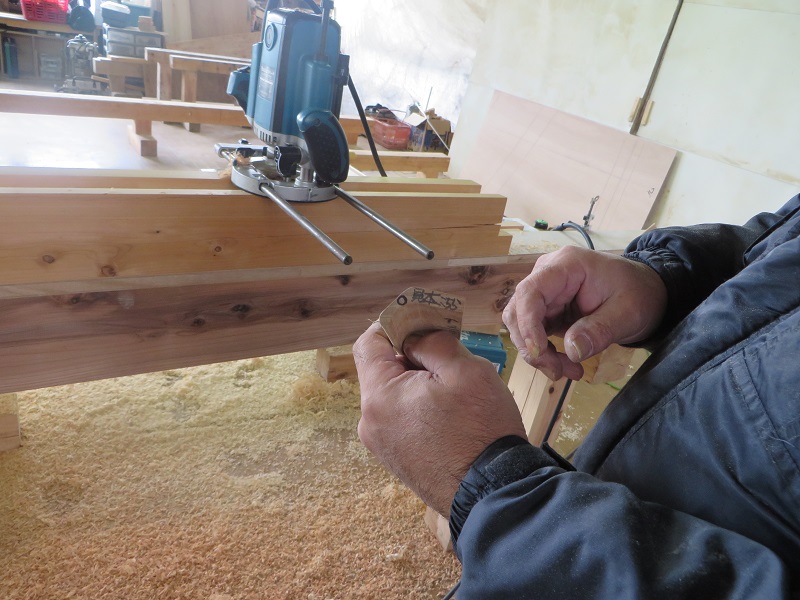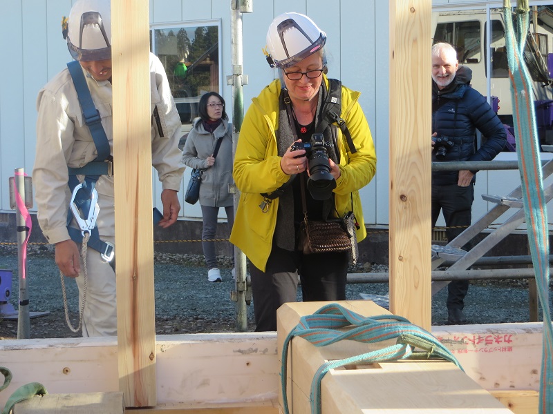 墨付け棟梁の大和田も来ていました。自分の墨付けが上手く組み上がるか気になるもんです。