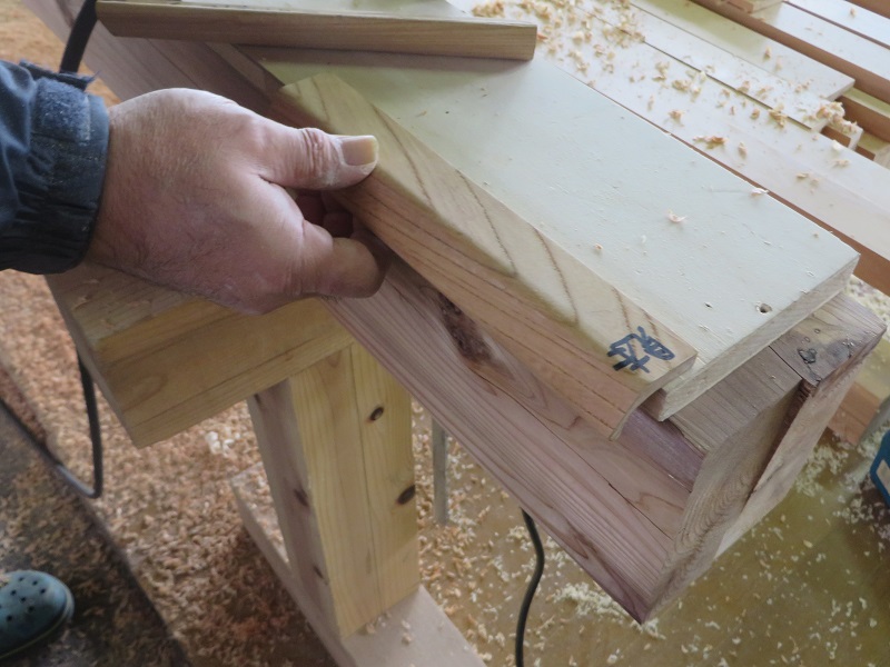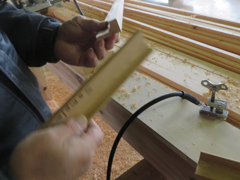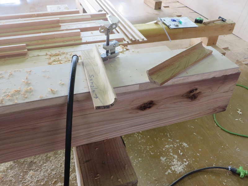 昨日好摩の作業場内を歩いていると、「社長見て下さい、杢創舎初のシデの木ですよ」との家具担当柳村の笑顔がありました。今現在来週末完成予定で工事に取り組んでいる下川原の大改修工事現場で使う引き出しの引手の数が膨大にあるので、手早くたくさんの引手を作る方法をあみだしたとの事でした。ルーターを写真の様にセッティングして、長いRのものを創って必要長さにカットする方法で数量を確保しようとの考えです。そして、このシデの木が自社製材した桟積み板の中にあったのです。オノレカンバの様に固く、加工するとスベスベして手触りが良くて、光り輝きます。そして曲面加工がし易いらしく、とても良い感じです。説明を聞いている私はとても嬉しくなりました。