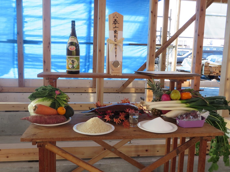 先日、写真家のマグダレナさんに撮影して頂いた雫石の新築工事現場では、上棟式が挙行されました。家族みんなで建てた栗の大きな大黒柱は立つところに祭壇を設けて、私が大工の祝詞をそうじょうして、大工とお施主様一緒に建物の四隅を清めての儀式は無事執り行われました。天候にも恵まれて、大安吉日の好き日で御座いました。