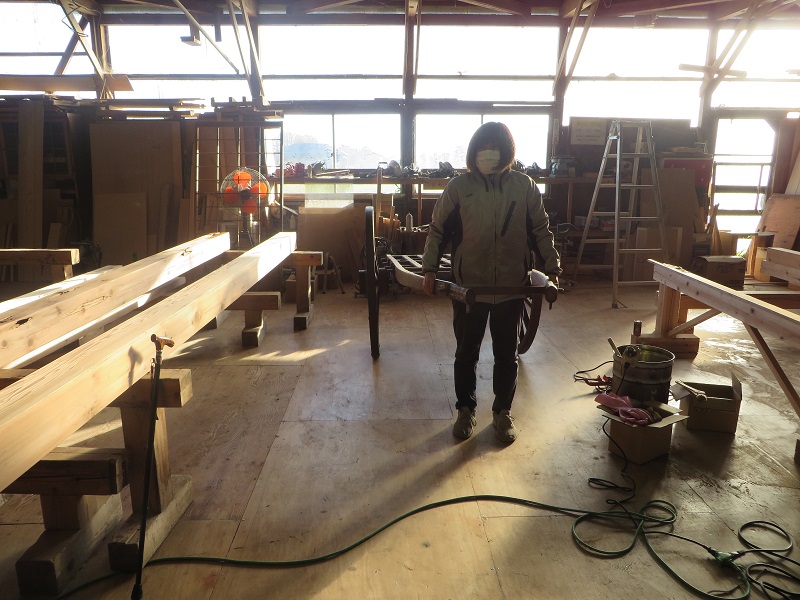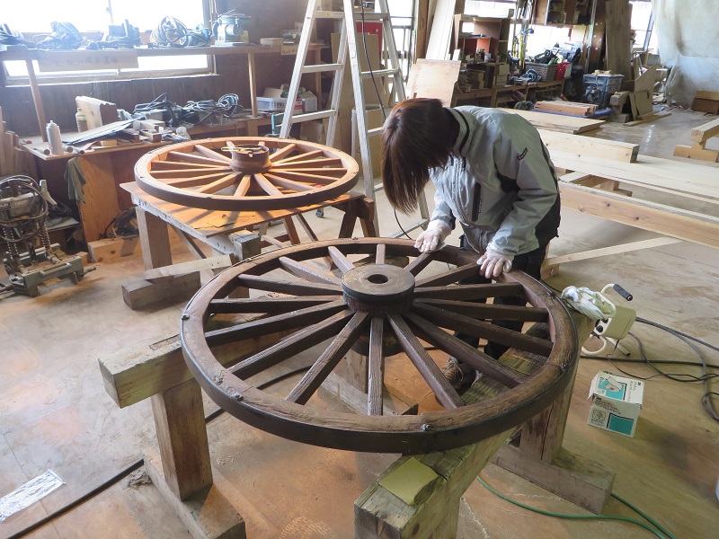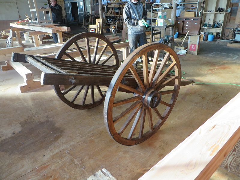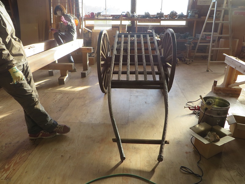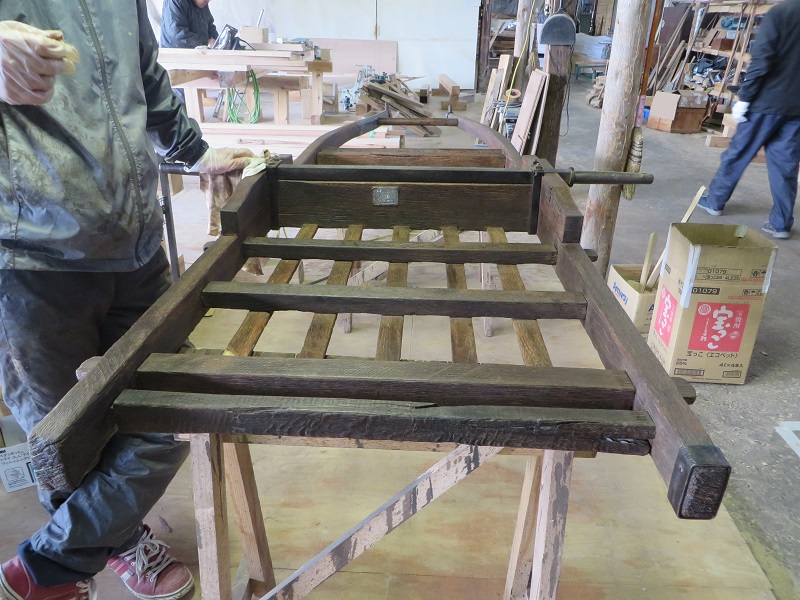 ある方からお預かりした大八車を修繕修復してみました。鑑札見ると盛岡市の荷車第一号らしいのです。見事に綺麗に再生仕上げしてくれたのは当社塗装職の安藤多能工です。その指導を受けて令和元年の春新卒入社の鈴木も手伝いました。この技術の継承を次世代に繋げて行きたいと思い、願ってもいます。