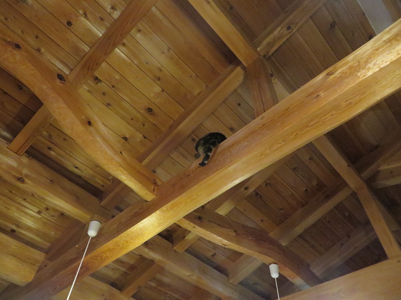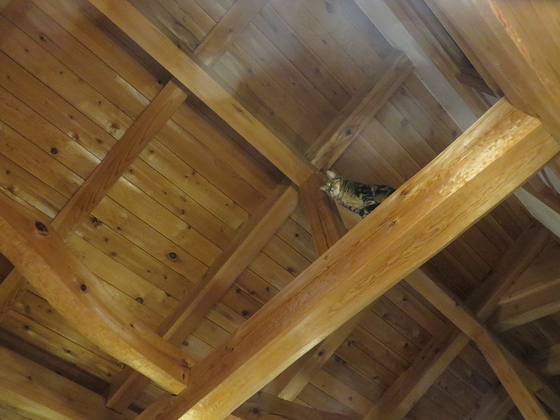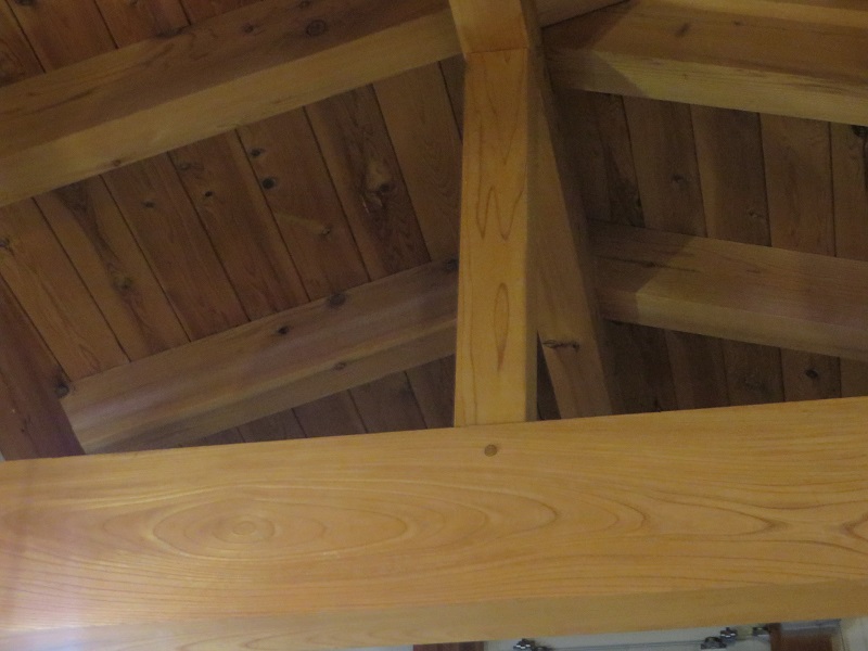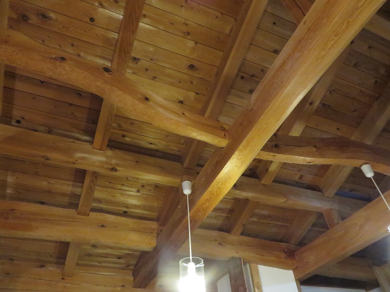 外がどんなに冷え込んでも、木の家のリビングに入ると、前夜に焚いた薪ストーブや暖房のお陰で仄かに温もる暖かな朝を迎える事が出来ています。そして、天井を見上げると、経年変化して木味の増した南部赤松の梁材が輝いているのです。とても気持ち良くて心から癒されます。木の家の良さはこの空気感です。そして、自然との一体感を感じる朝の一時の心地よさなのです。鋸の写真も混ざりますが、新築時から10年以上が経過しての一味増した姿の写真をご覧ください。