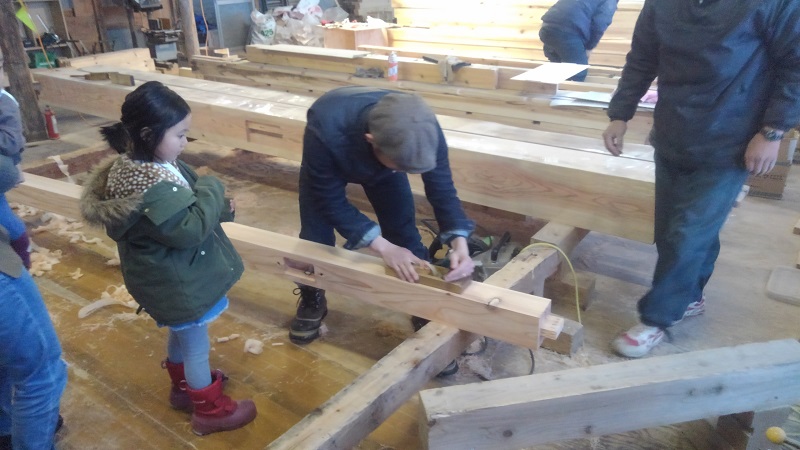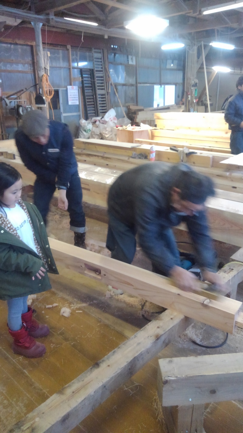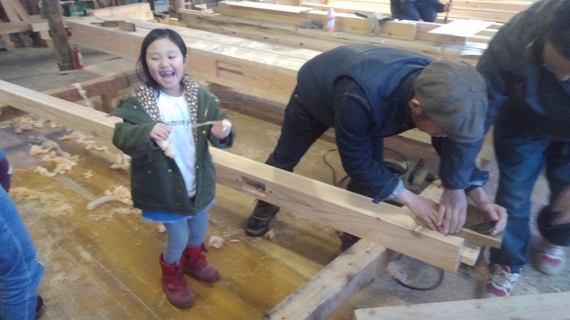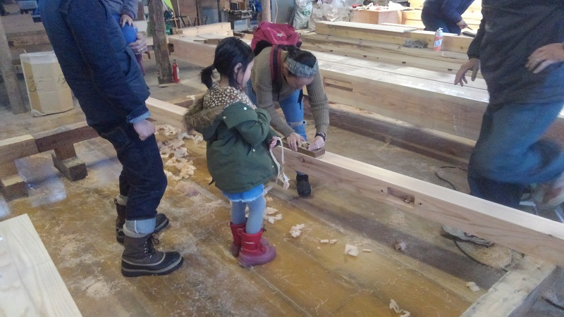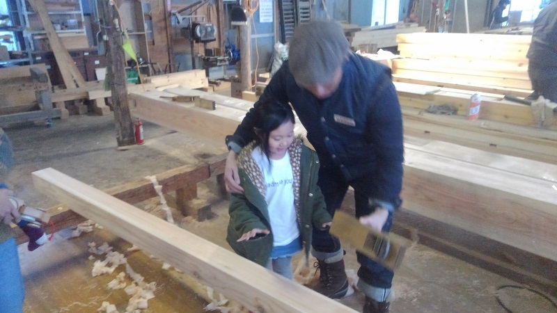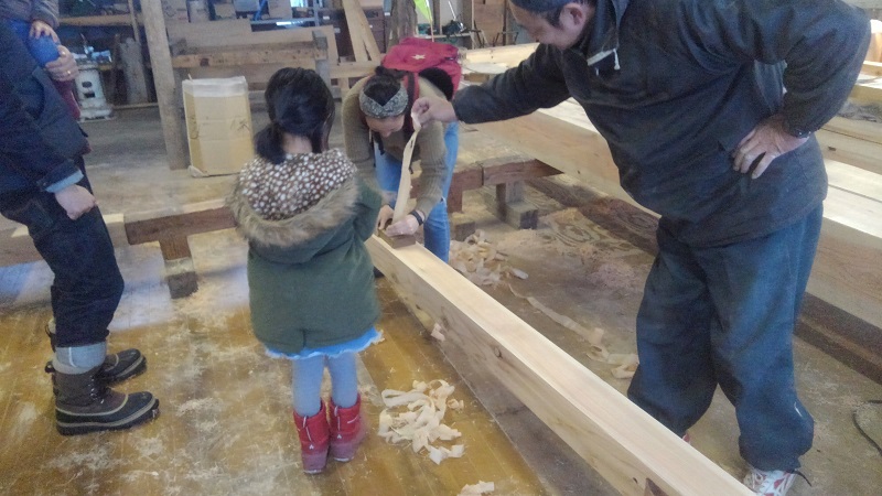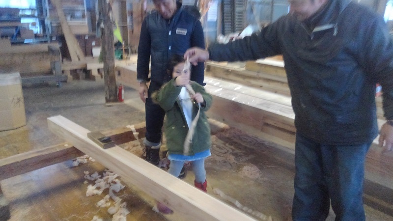 先週の土曜日、滝沢の新築工事のお客様ご家族皆様が建て方材の見学をされて、同時に自宅の柱に鉋を掛ける体験をされていかれました。