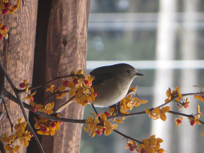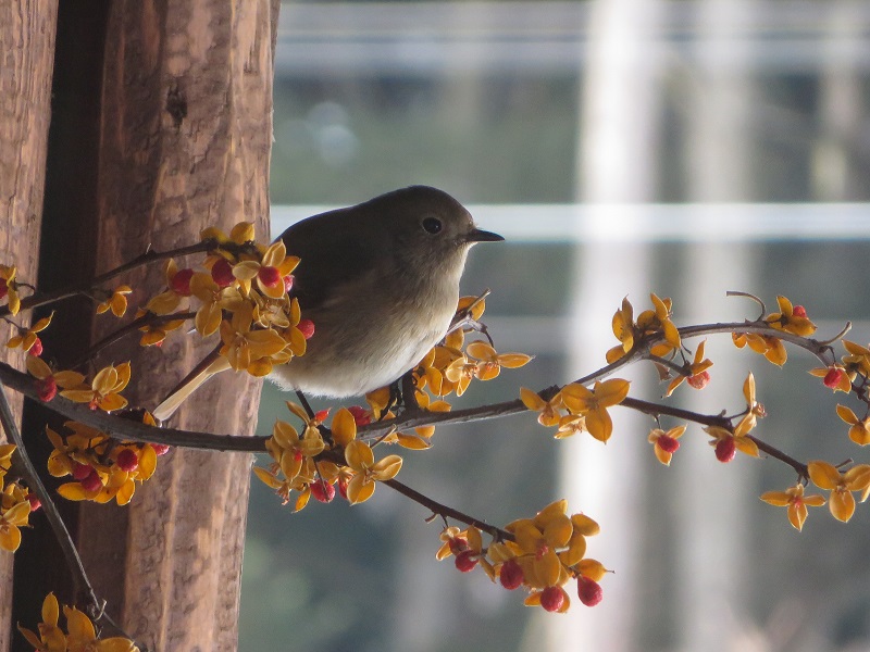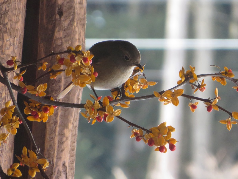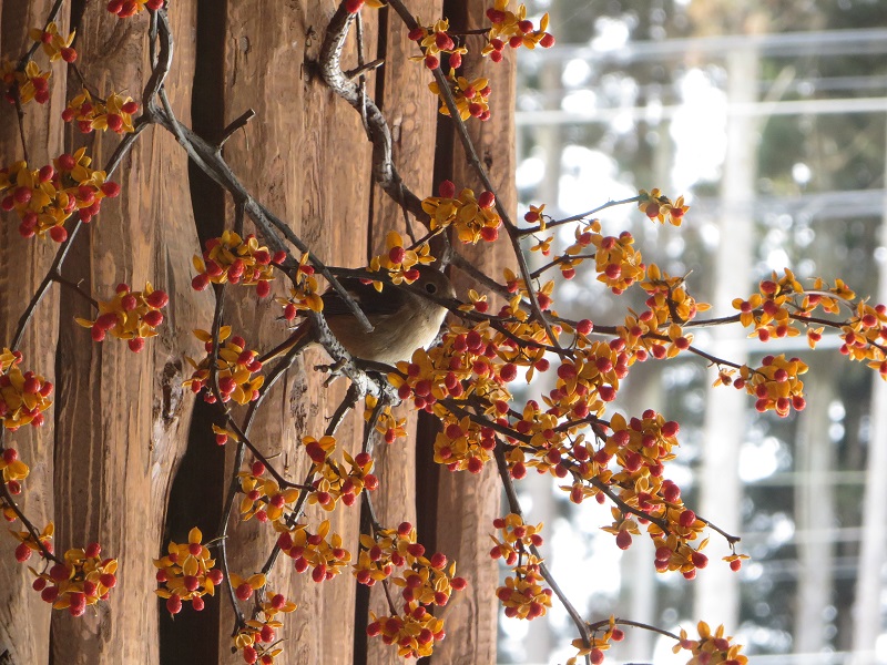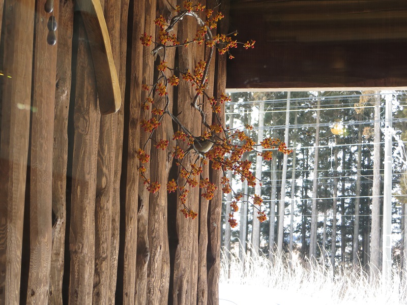 私の仕事部屋の通路に飾ったツルウメモドキを小鳥たちがついばみに来てました。この小さな命を育むであろうと思えるこの場所が貴い雰囲気に思われます。日本中のどこにでも人の暮らしと小動物が共生していた時代があった筈ですが、ここ好摩には今もそれが残ります。小鳥はこれで食を得て、我々人間は生きる安らぎを得て癒されています。なかには「あーっ全部食べられたー」と嘆き騒ぐ人も居る事は居るのですが・・・