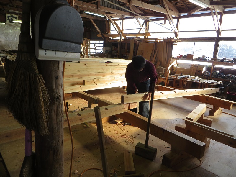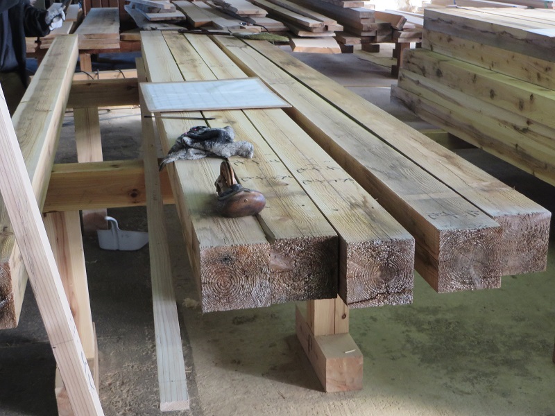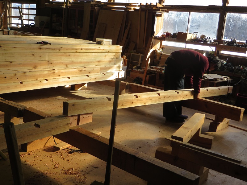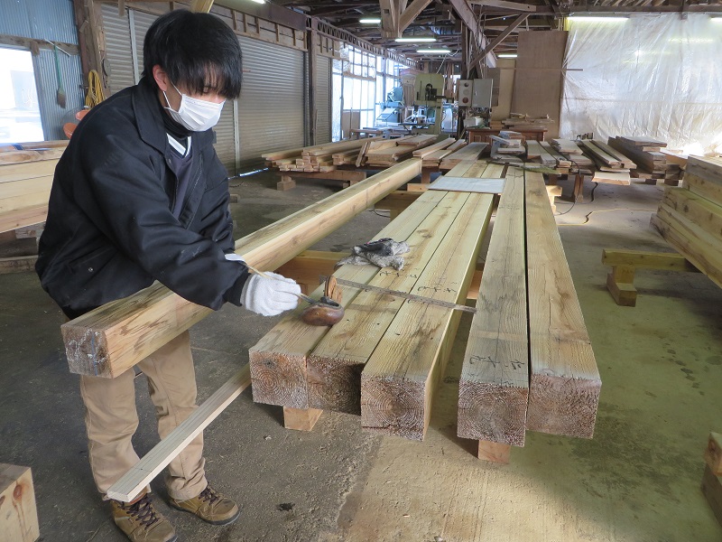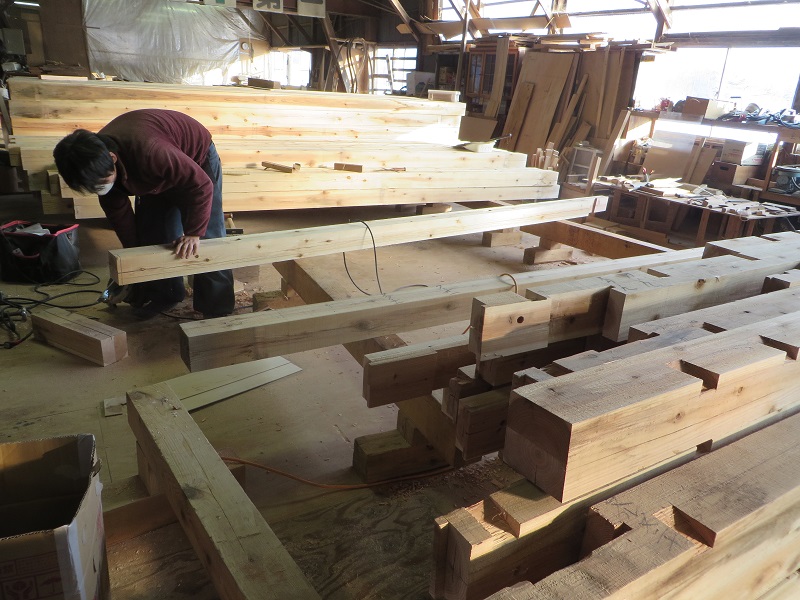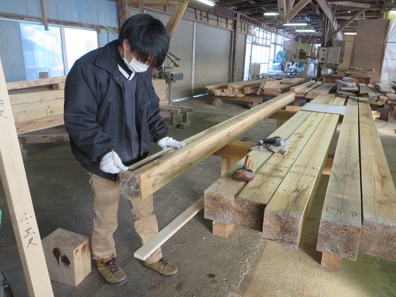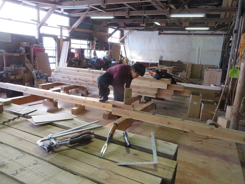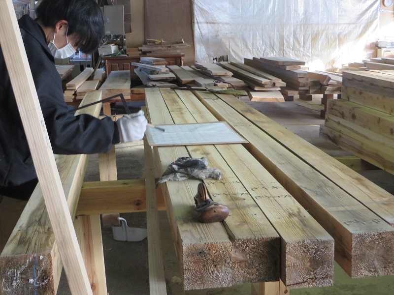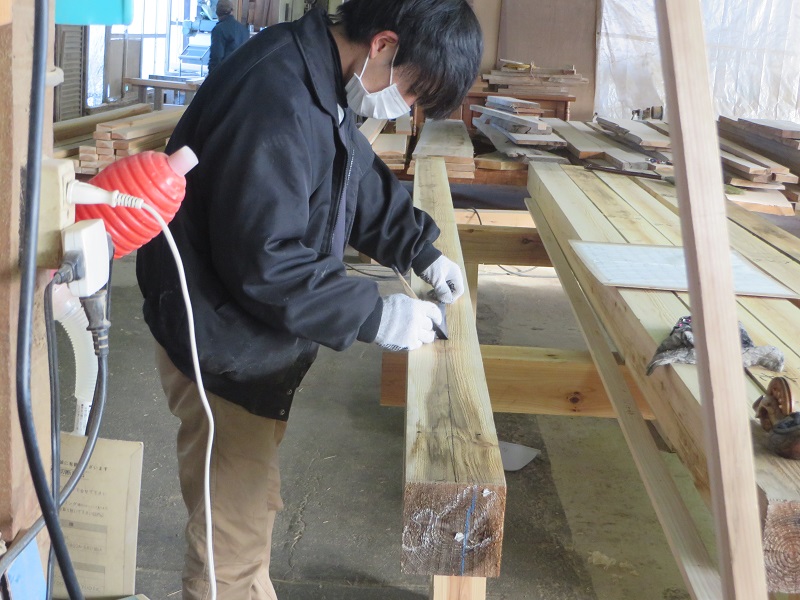 入社5年25歳の大工の成長を見る日々に嬉しさを感じています。現在好摩の作業場で墨付けしながら後輩が行う刻みを指導しています。昨今は日本各地で若手だいくの育成に情熱と力を注いでいる情報を目にしますから、それは今後の日本の為にも地域の為にもとても重要な事だと誰もが感じているところです。我社もそれは同様であり、実際に取り組んで参りました。その成果が添付の写真の様に現実に形になり始めています。しかも、この傍には定年退職した棟梁大工が確りと見詰めていてくれて、とても有難いのです。