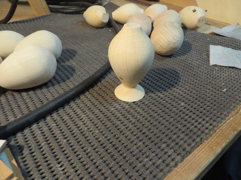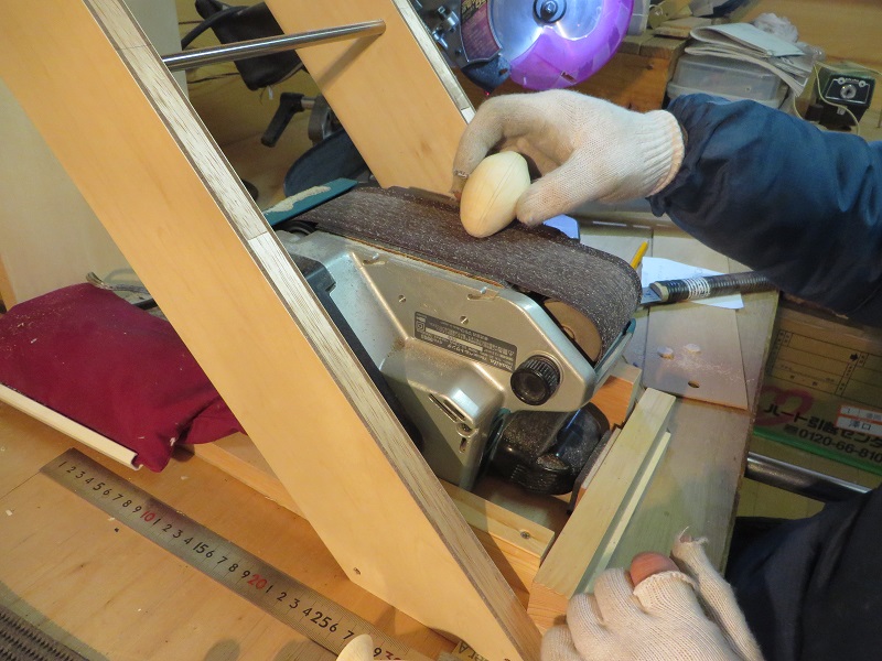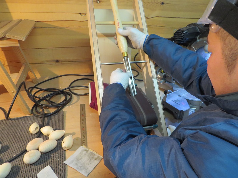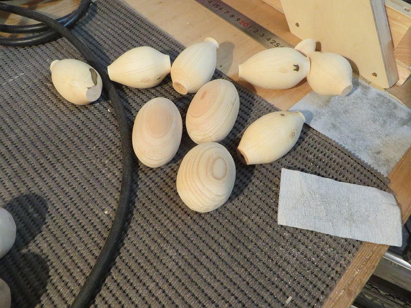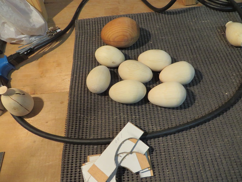 伐採した樹木を何かに転用して使えないだろうかと考えていたところに、旋盤機のセッティングがされたのをこれ幸いに、以前東京おもちゃ美術館で見た木の玉のプールを思い出して、木の玉子制作を始めてみました。