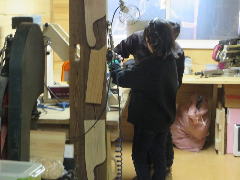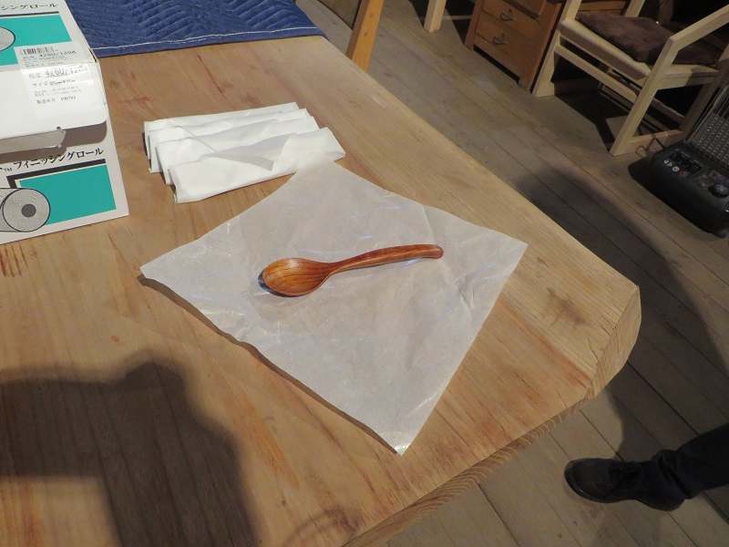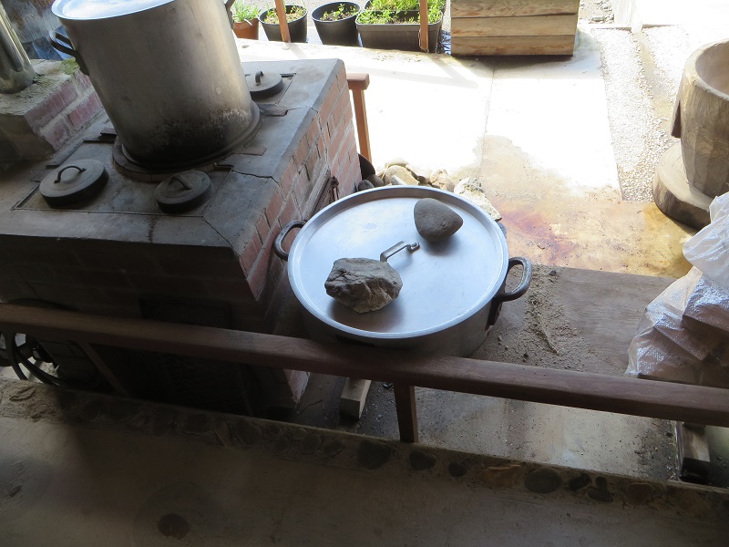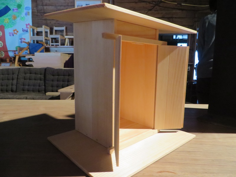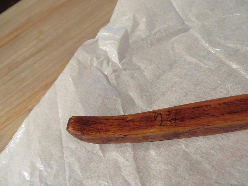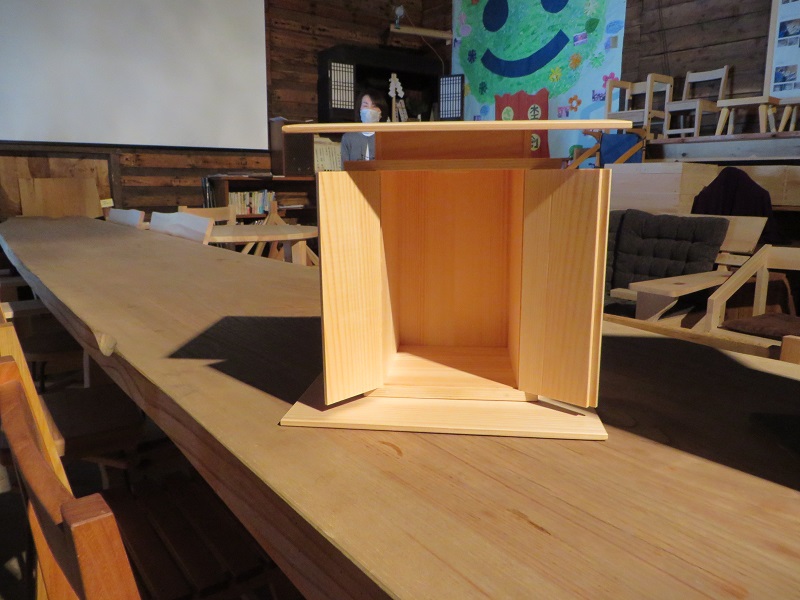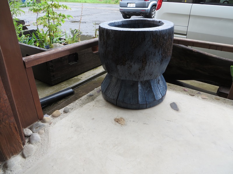 安藤の手にかかると、木の臼をバナーで焼いて無色透明のUV塗料を塗布して、この写真の様な色にセラミックス化させたり出来るのです。古民具の再生もお手の物です。