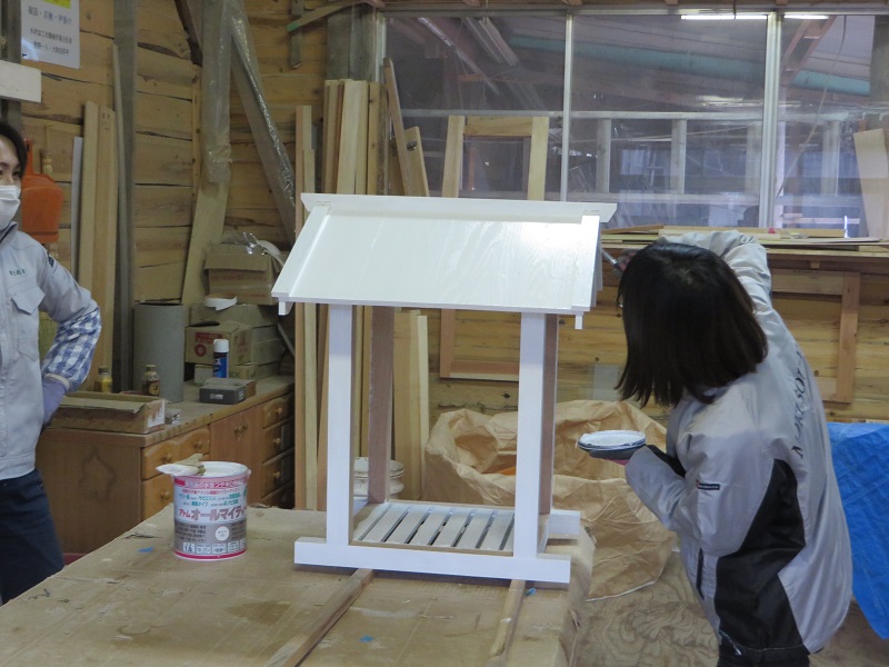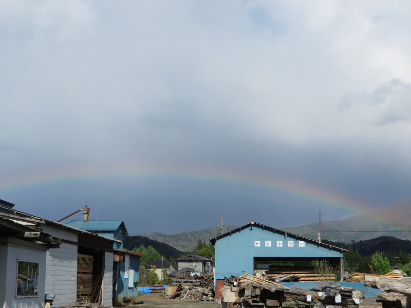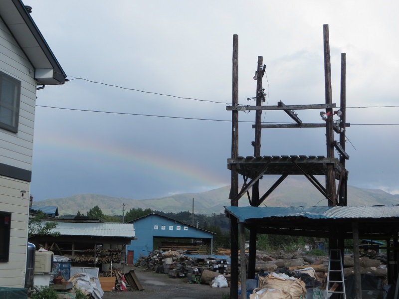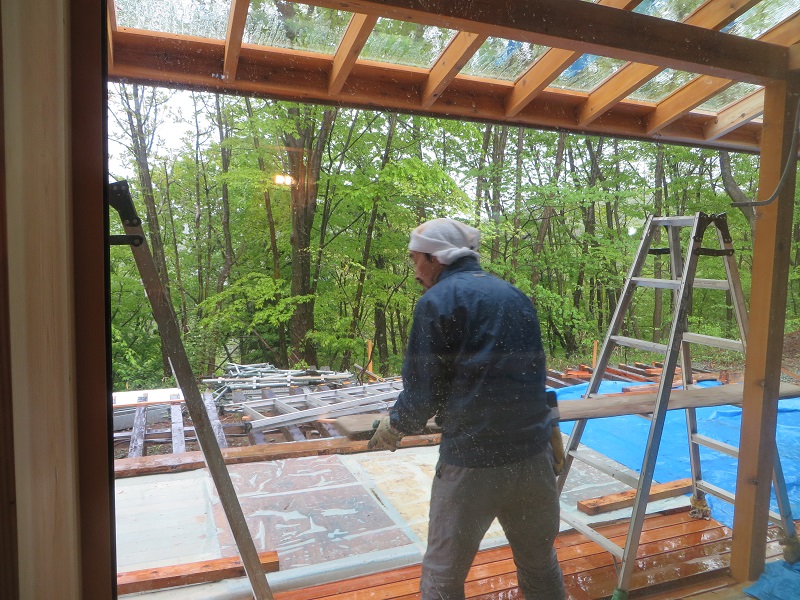 まずは、滝沢の新築現場訪問が先でした。庭と云えば庭、森の緑がそのままリビングに飛び込んで来る素晴らしい景色です。雨でも屋根下なので、濡れることなく垂木の塗装をしていたのは弊社塗装職人の多能工安藤です。