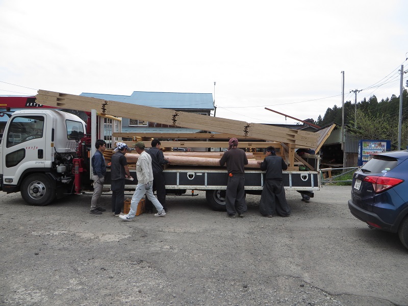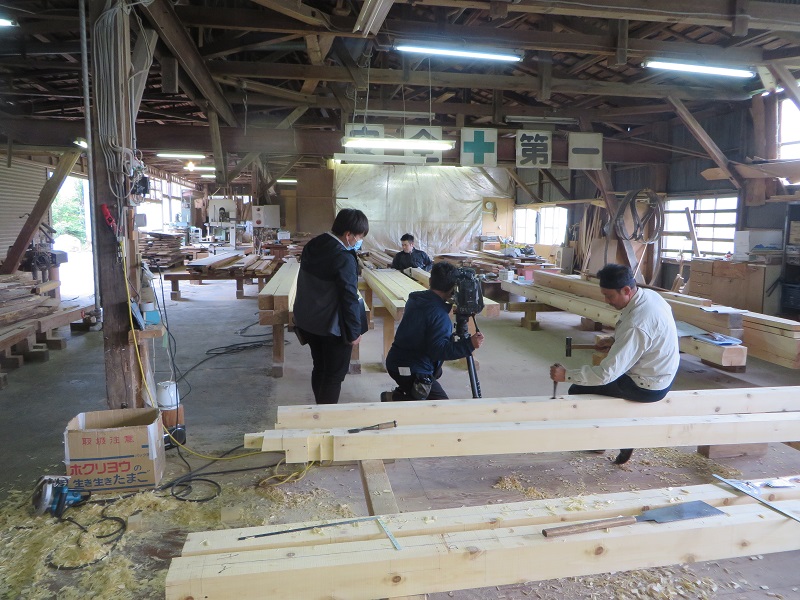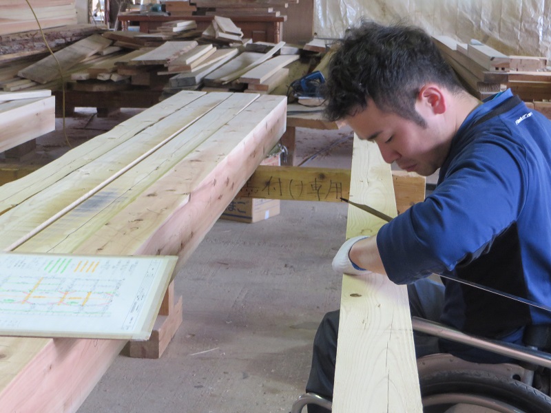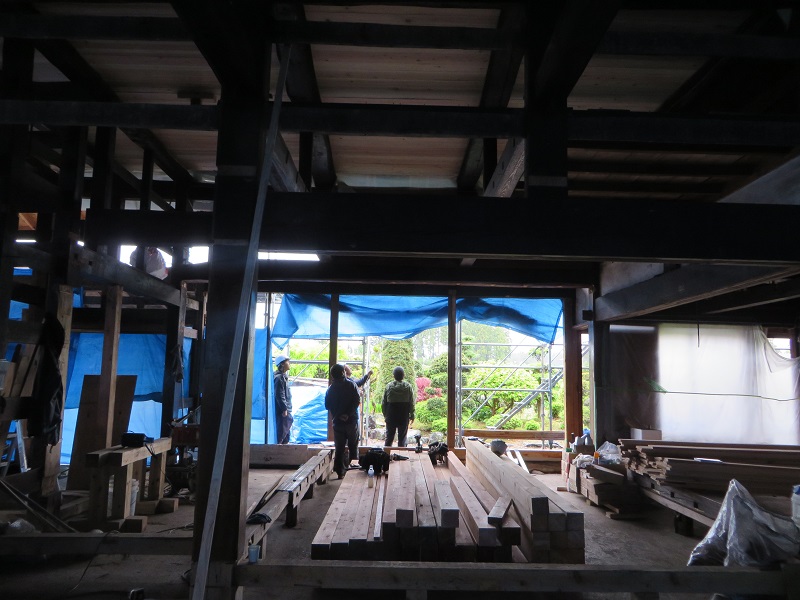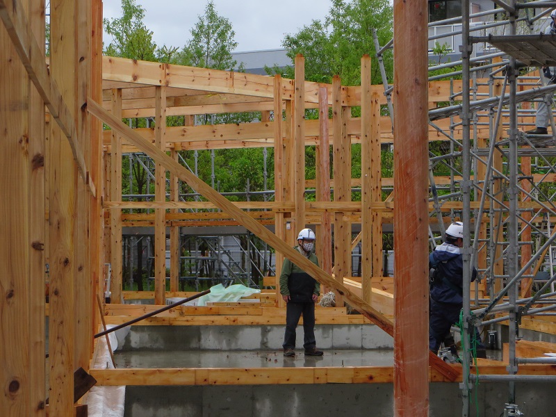 生憎の雨の建て方で、私も現場内に入って皆に挨拶しましたが、雨に打たれながらも明るく挨拶を返してくれて、嬉しく思いました。基礎メンバーもこの現場に居て、田村部長共々脱落防止の安全ネットの取り付けをしてくれていました。設計部長までも内部の移動足場上で大工共々働いていました。どんな現場もそうですが、大切なるは人です。ここでは、今年入社の新人大工も先輩の指示に従い一生懸命に働いているのを眼で見れて嬉しく感じました。
