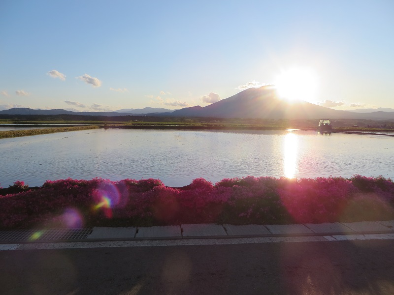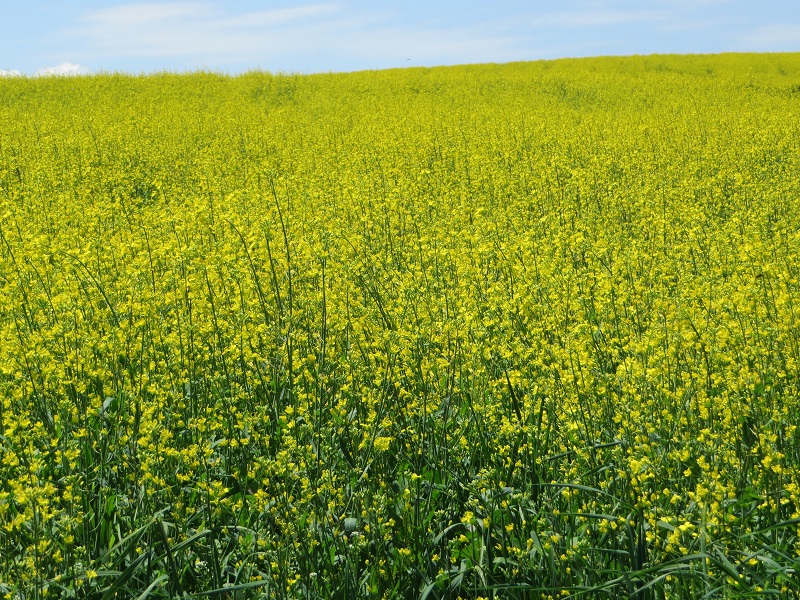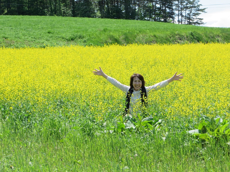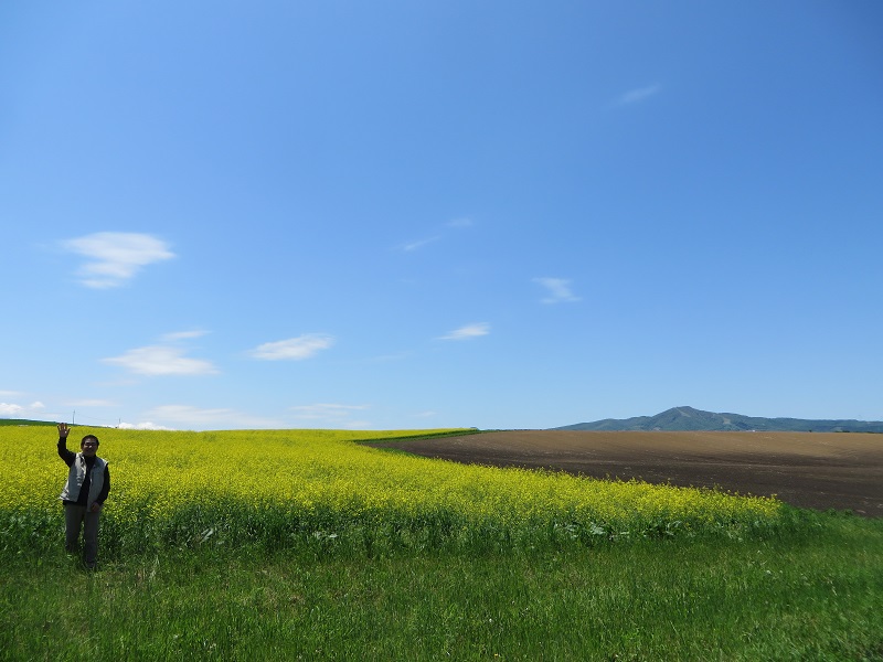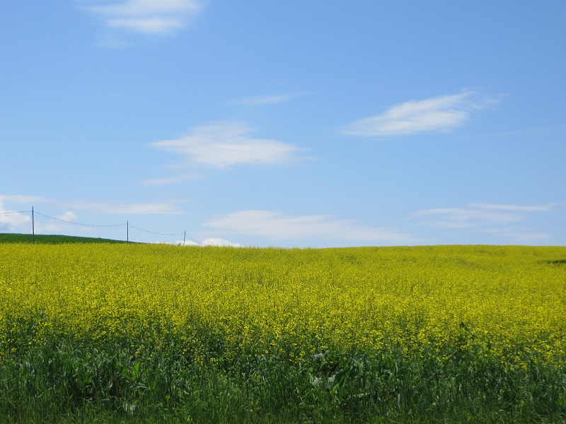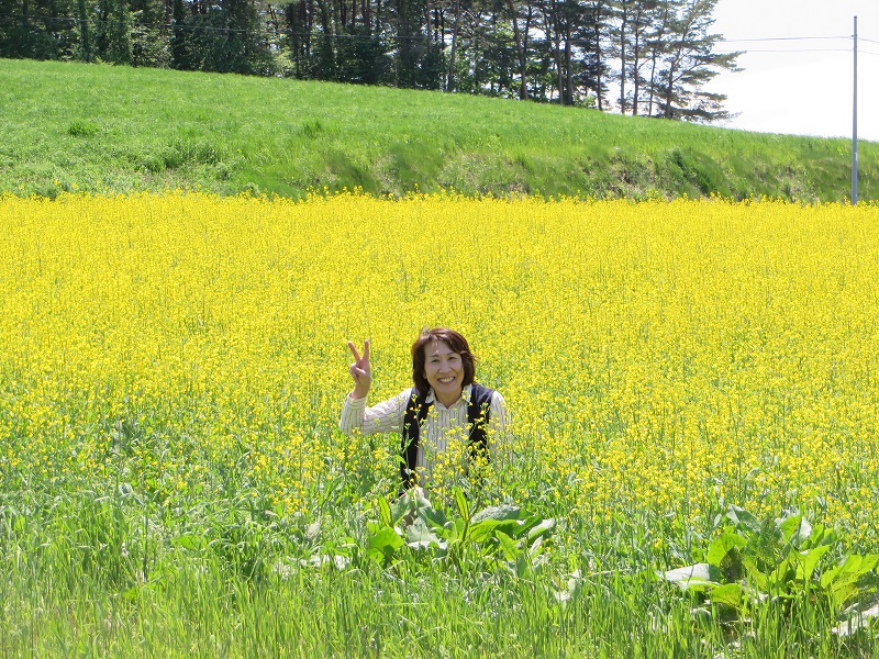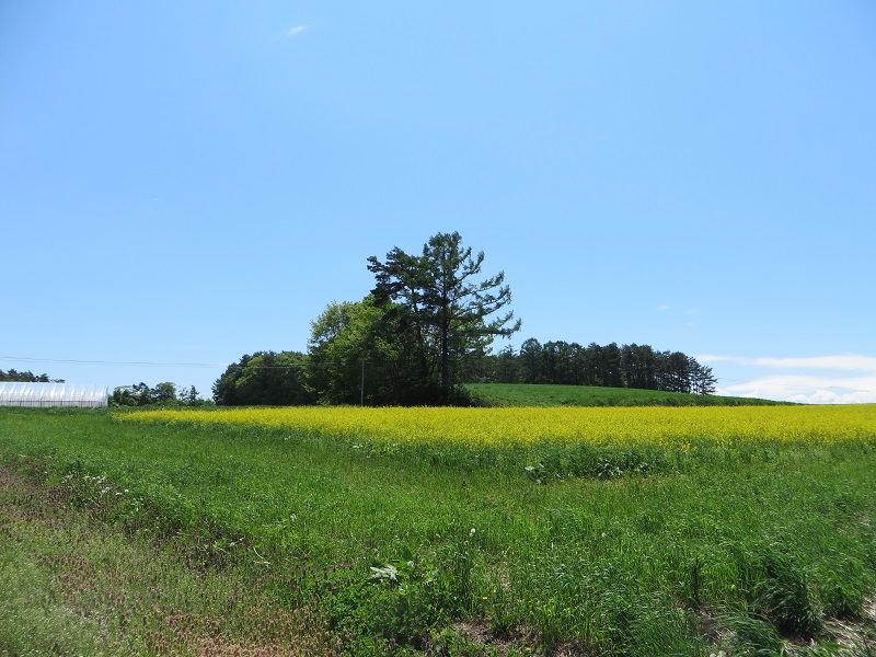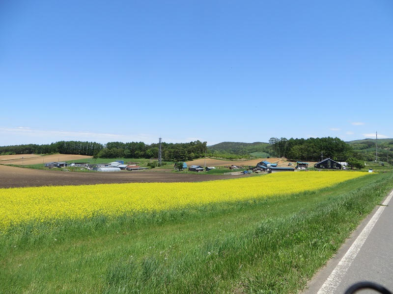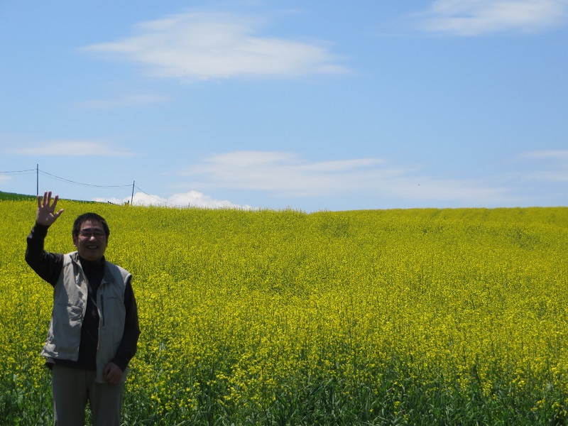 次の目的地は雫石下川原地区での改修工事現場ですが、小岩井農場を通過する道脇の菜の花畑です。
