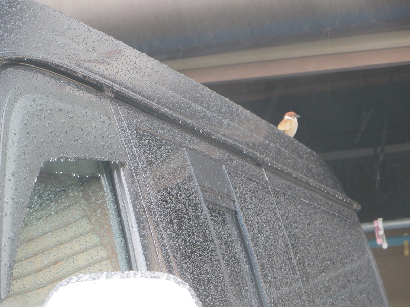 私と同じ病気で入院中で、車椅子生活が予測される方が退院後に自宅で生活できる様に改装されたいとのご依頼で工事させて頂いています。現場に着くと大工の車の屋根でスズメが雨宿り中でした。