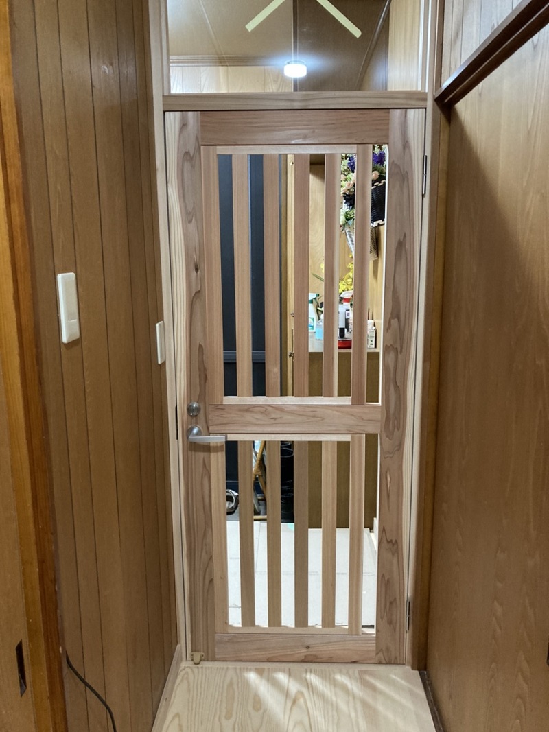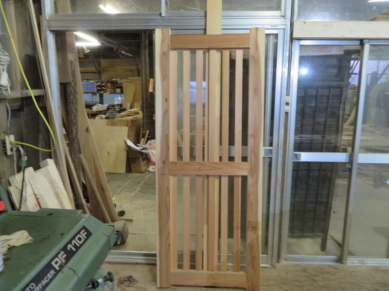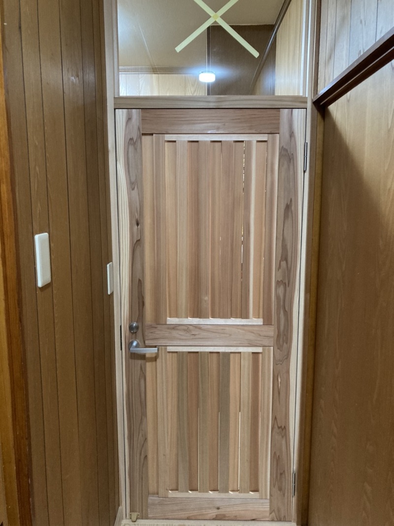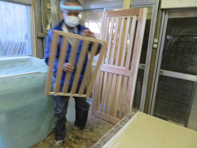 ここは柱に取り付いていた鴨居を外した刻み孔に埋木をして綺麗に隠した部分を古色仕上げした当社の大工と塗装職の仕事です。この埋木そのものは現地調達です。