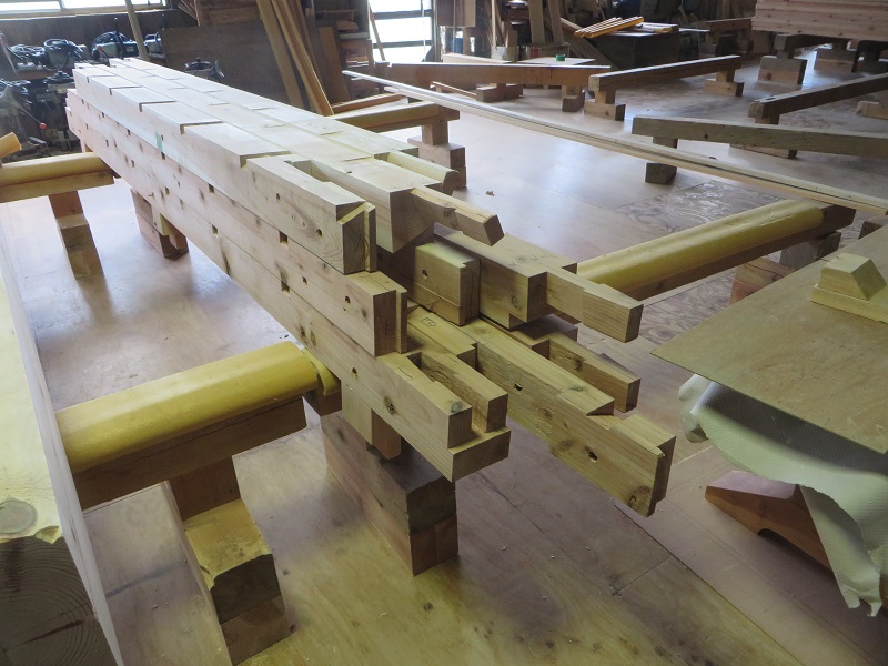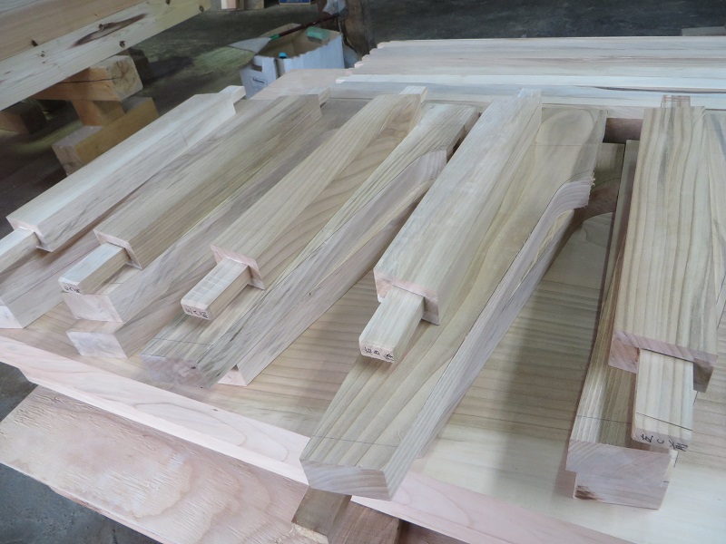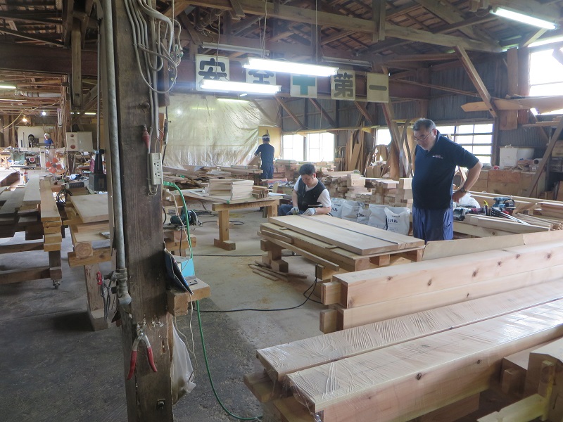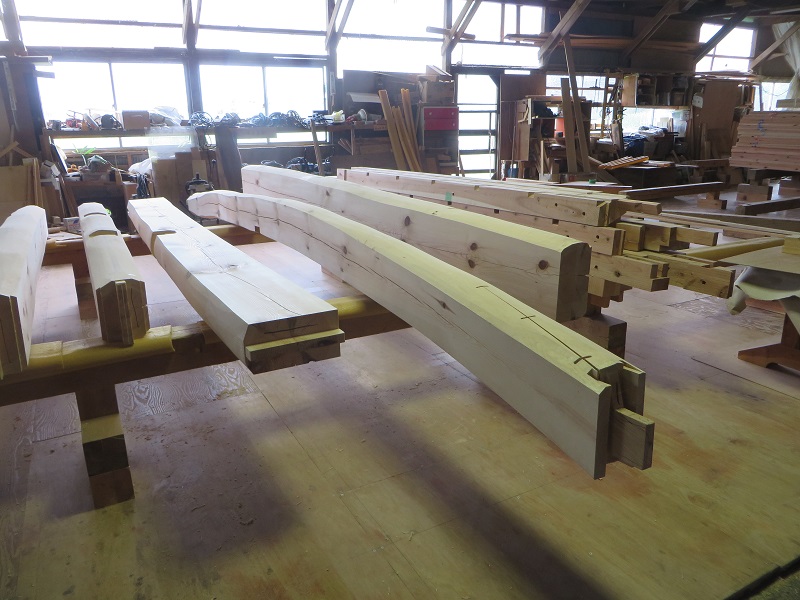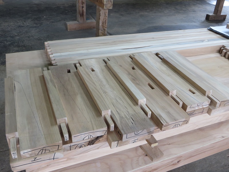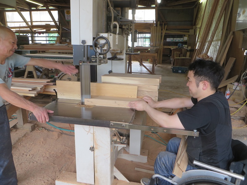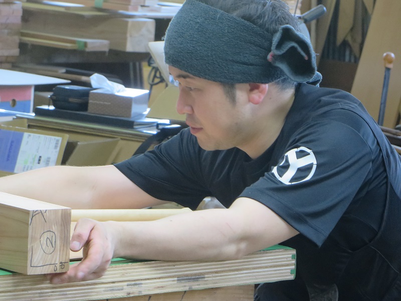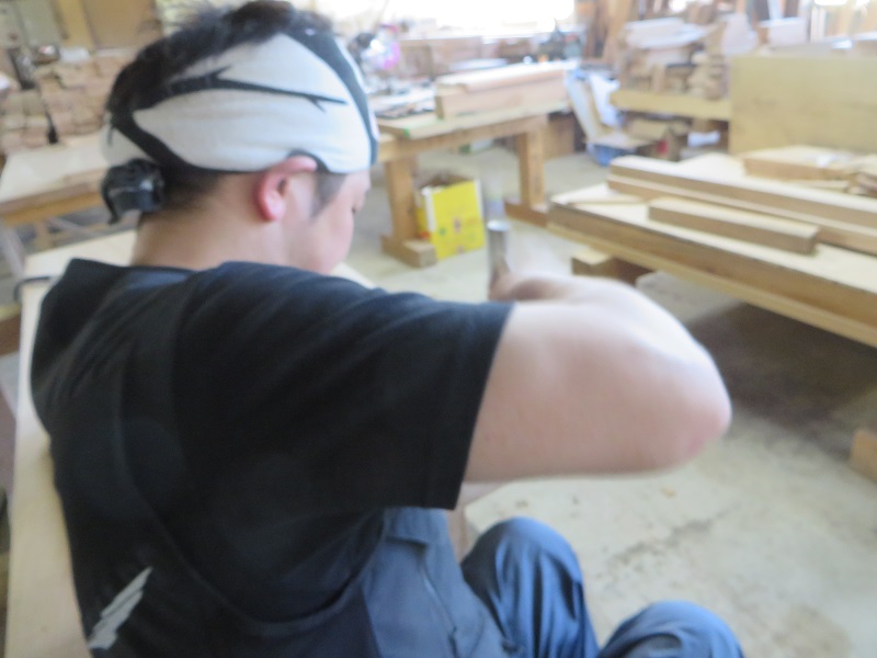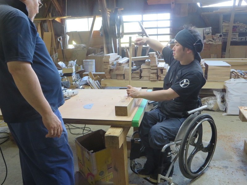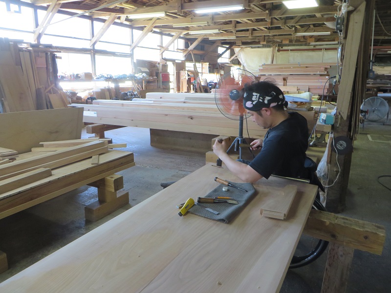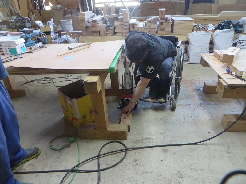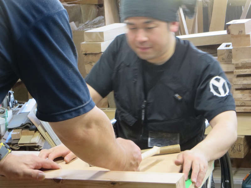 潜造りに取り組む車椅子大工ですが、何時も一人と云うことは無く、誰か彼かが手伝います。こうして皆の協力があってきちんと造り上げる一体感が大工の木組みには存在しています。家具の仕口の傍にはこれから現場に向かう構造材の仕口も見えていて、木を組み合わせて使う技術の良さ凄さを感じるものです。木があっての職人であり、木に活かして貰える職人なのだと再認識しています。それは、木を使いデザインする我々設計士にも同じことが言えるのだと思います。