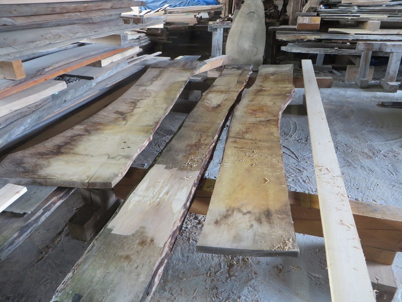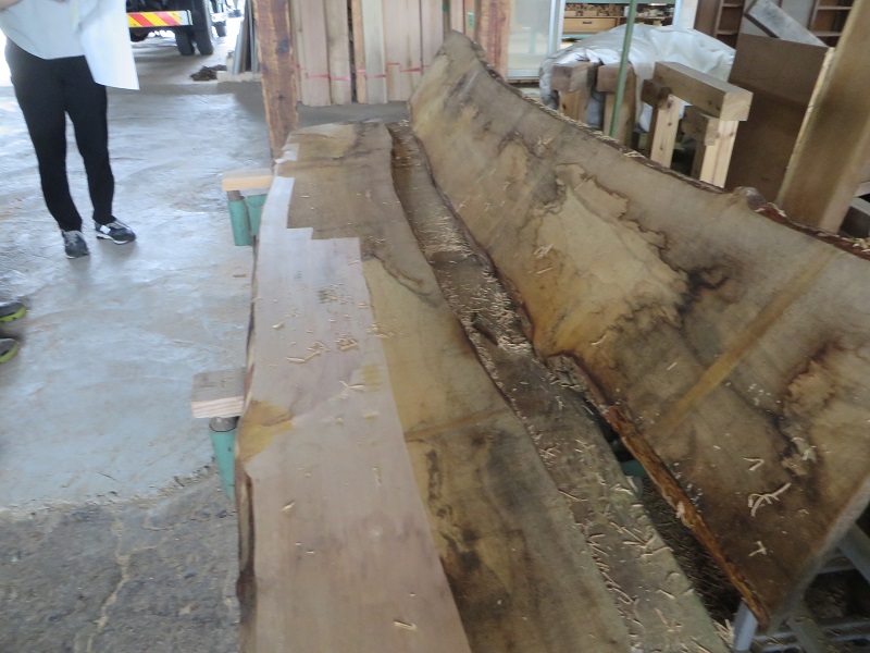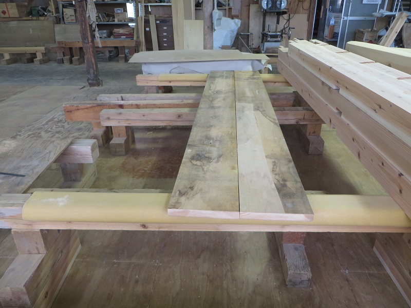 カヤの木のカウンター下の収納も出来てきました。引き出しの前板は桂の木の板です。それを製作する同じ場内では、車椅子大工の家具造りも進んでいました。それも同じ桂の木なのですが、収納の引き出し鏡板は、古材の再利用品です。同じでも経年変化によってその表情にかくもの違いが出ています。