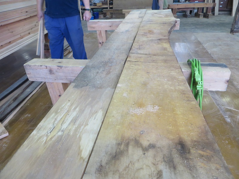 1階台所に食器棚付きカウンターと2階に手洗い付書斎カウンターを造り付ける工事をご依頼いただきました。そこで、カウンター材として準備したのが榧の木の板です。将棋盤を造る木として有名ですが、平安や鎌倉時代だとカヤの木で仏像を彫ったとも云われている現代では貴重な材となる筈です。丸太で届いた時は小口が赤くて驚いた記憶がありますが、鉋を当てた木肌は光り輝く様な感じで、大切にしたいものだと感じました。