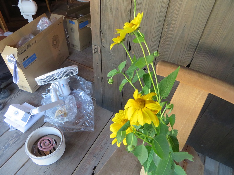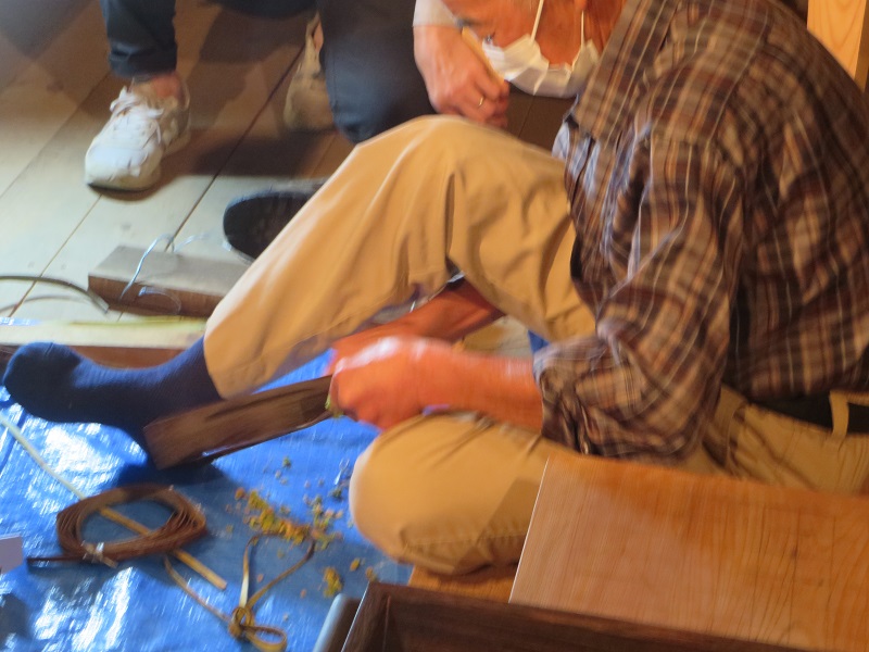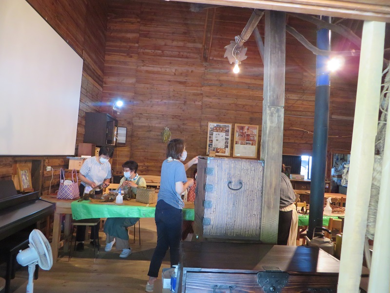 先週の土曜日もカゴ編みしていましたね。暑さにめげずに取り組んでいる方々を気にして、扇風機もお目見えでした。