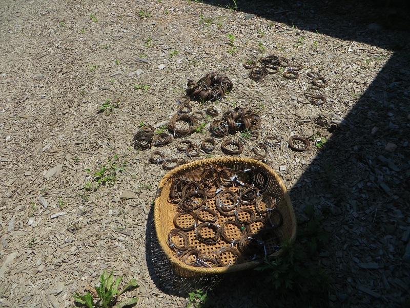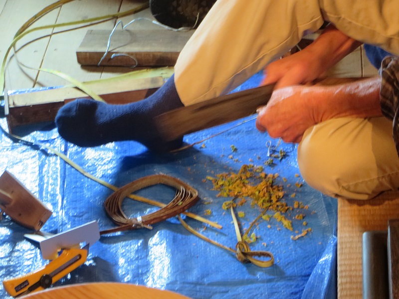 毎週土曜日に行われているカゴ編みワークショップに先週は、ご年配の樹皮採り名人がご参加されていました。鉈で胡桃の木の樹皮をしごいて鞣す手業には年季を感じました。また、五回目ともなると素敵に仕上げた参加者も居て、益々楽しそうな雰囲気でした。