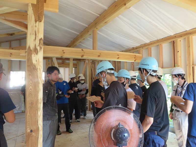 昨日も猛烈な暑さでしたが、浄法寺の新築現場には、岩手県立二戸高等技術専門校建築科の学生18名と引率の先生4名の総勢22人の建築現場見学研修がありました。日頃から建築を学んでいる学生を前に私が建物の大枠を説明する事に加えて、断熱性能を確りと造り上げている事と、使われている樹木の事も話し、引き続きで実際に墨付けと刻みを行った大工にその秘儀なるところをも説明させて頂きました。写真のこの中から、日本の建築を担う若者が育ってもらえればと切に願う次第です。