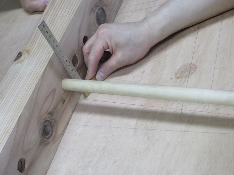 家具造りしていた筈の車椅子大工ですが、プレカット材が運び込まれて、手刻みとのハイブリット構造なので、一度終えている手刻み構造との絡み部分の墨付けを急遽行っていました。あっちもこっちもと大忙しで働く車椅子大工でした。