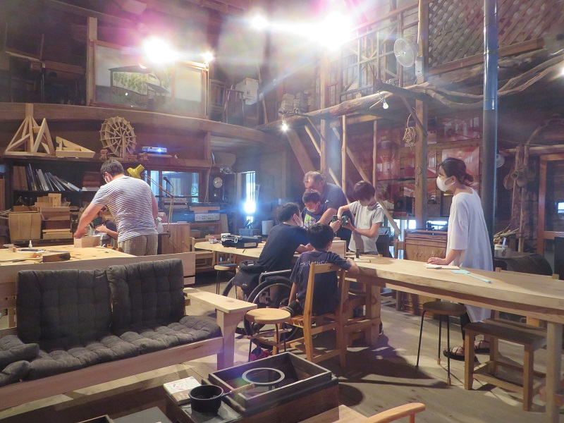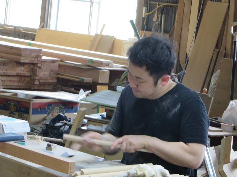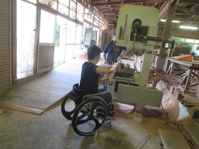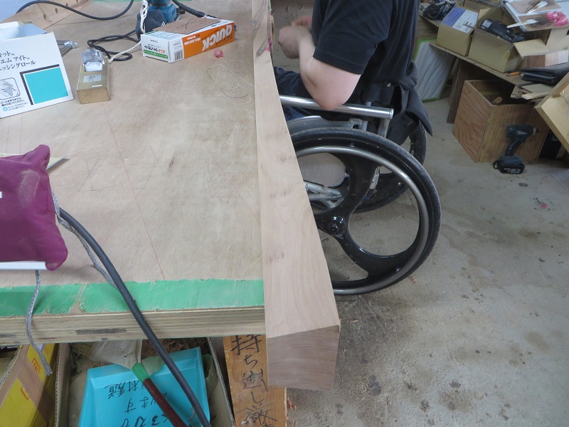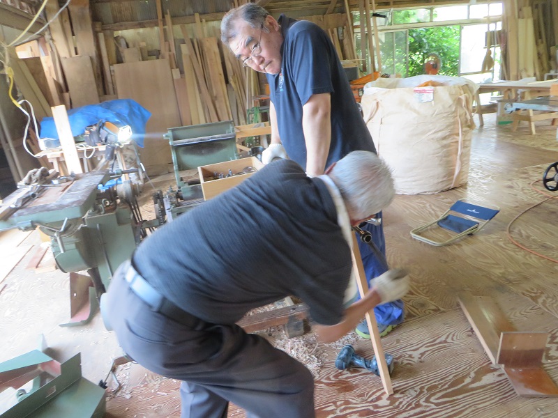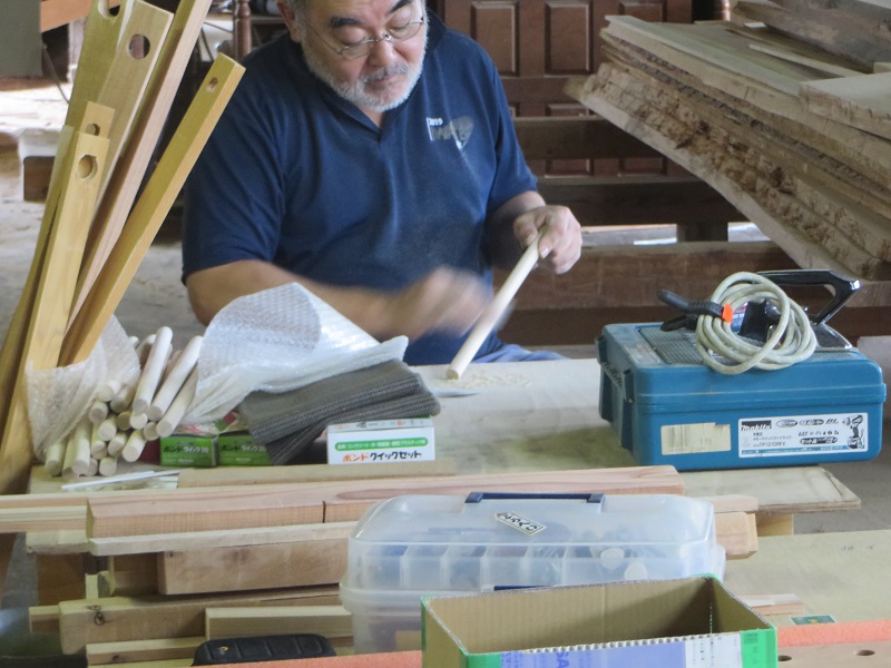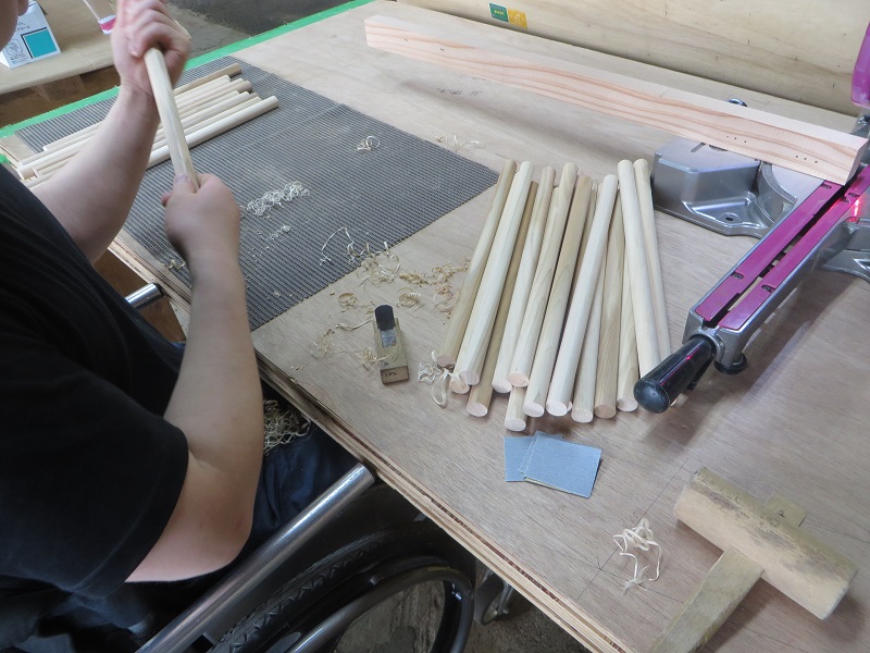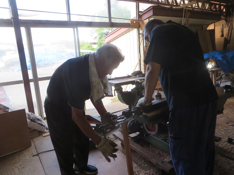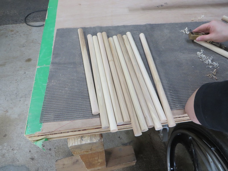 車椅子大工の家具造りは、椅子の肘掛け背凭れとなる丸棒造りをしていました。見ていて楽しくなるのはカメラを手にしている方だけで、実際に手を動かす面々は「手が攣りそうだ」と云います。