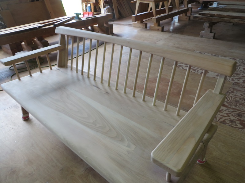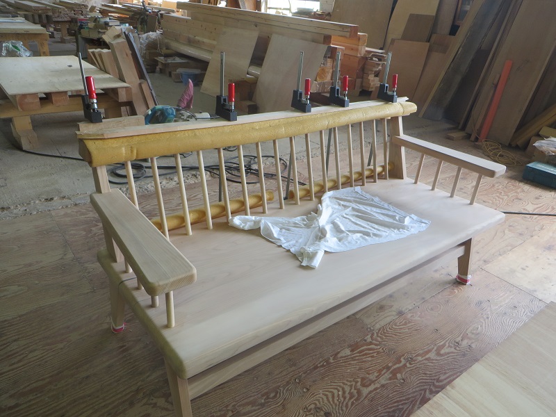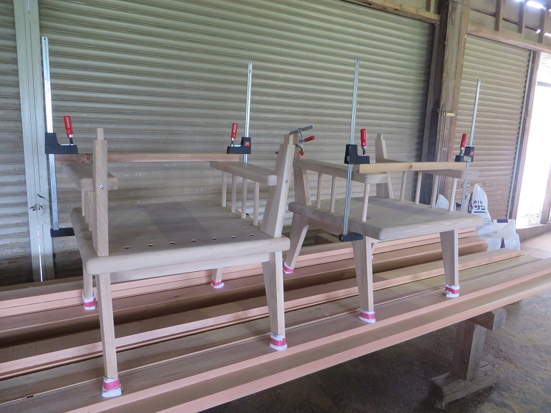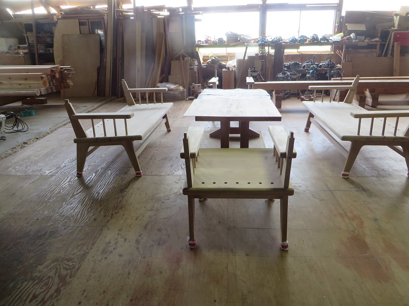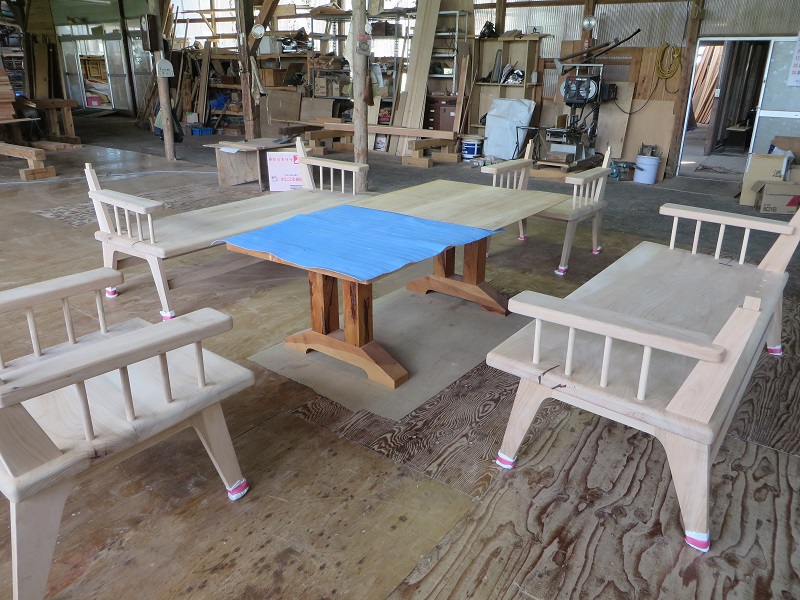 車椅子大工の家具造り、応接セットが出来上がって来ました。正味二か月応援の手こそ有りましたが、車椅子に乗ってのこの仕事を無事熟し、お盆明けに納品させて頂きます。猛暑の中本当に良く頑張ったと思います。更にまた引き続きのサイドボード造りが続けられます。
