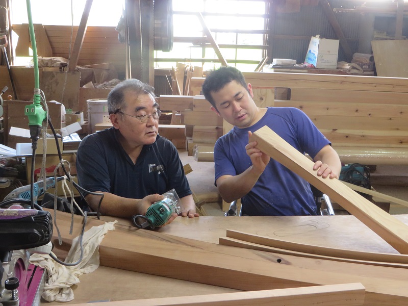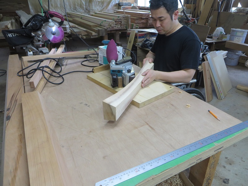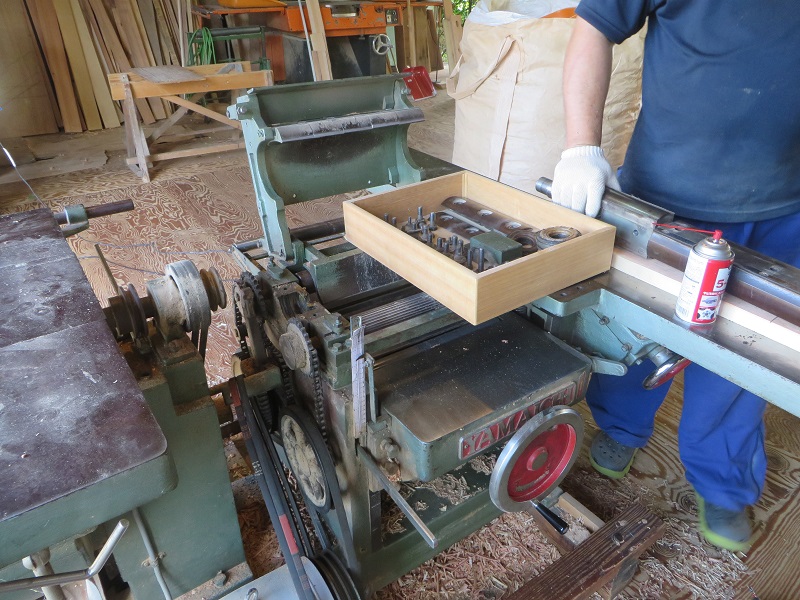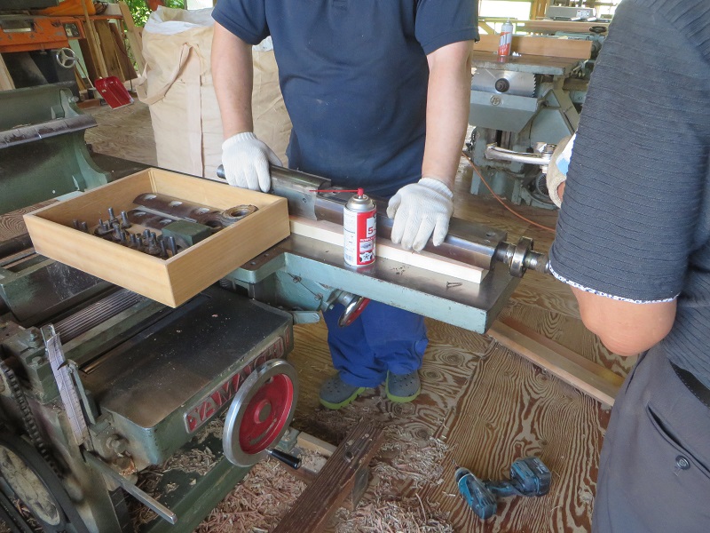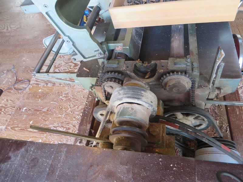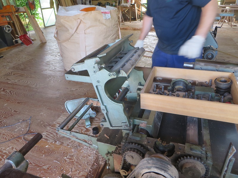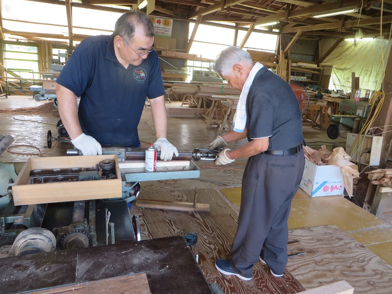 無垢の木を扱う事が主なので、万能機が今でも活躍しているのが当社の特徴です。そうなると、写真の様に機械のメンテナンスが欠かせません。こうした動力で動く機械を熟知した年配の機械屋の存在はとても貴重で有難いものです。御年70のこちらのお方は、いつもぶらりとやってきては身近な出来事を話していく好々爺で、無駄話のお付き合いをしているのですが、それが時としてこの様に大恩人に変化して心強いものです。長年の知識に敬服してしまいます。全く儲けにもならない事を懇切丁寧にしてくださいます。大切にせねばなりませんね。世の中そうした事がたくさんあります。