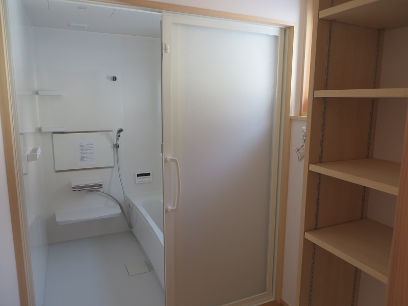 UB前の脱衣室には収納棚も付いて洗濯機のこの横棚は便利です。