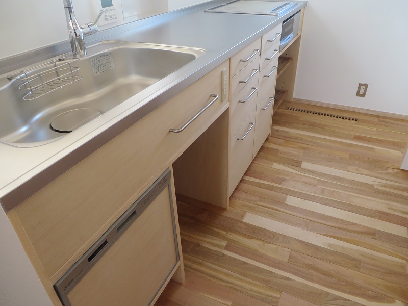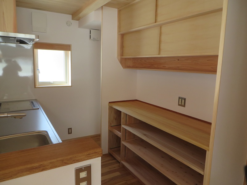 台所の流し台の後ろにも造り付けの棚が配置されています。