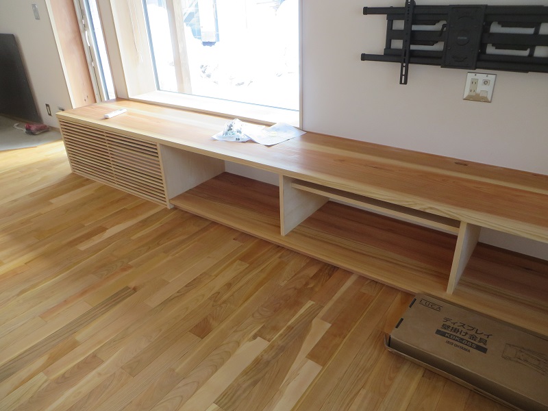 ローボード造り付けで、床下エアコンも取り付けられて目隠しの格子が付いています。