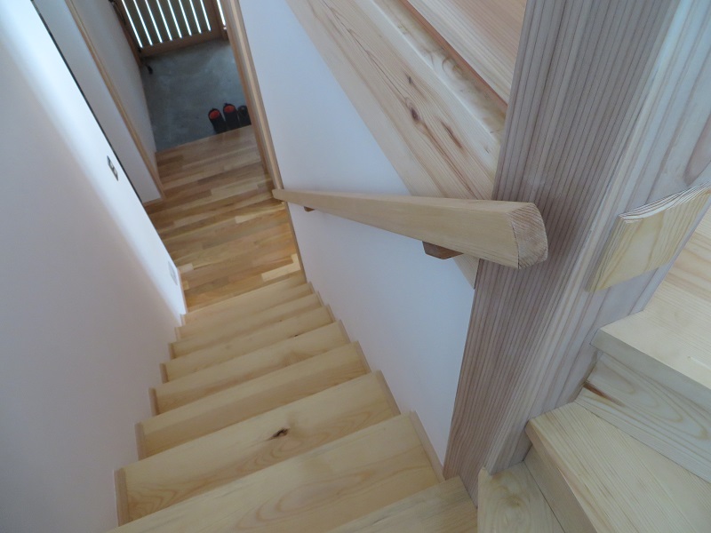 水回りと繋がる2階への動線階段は赤松の無垢材で梁材との兄弟材です。