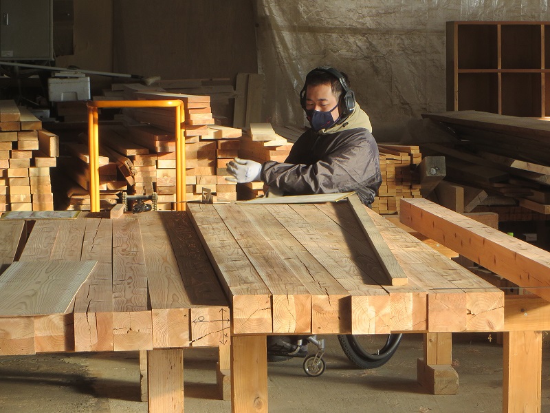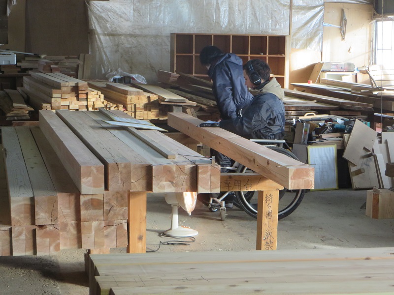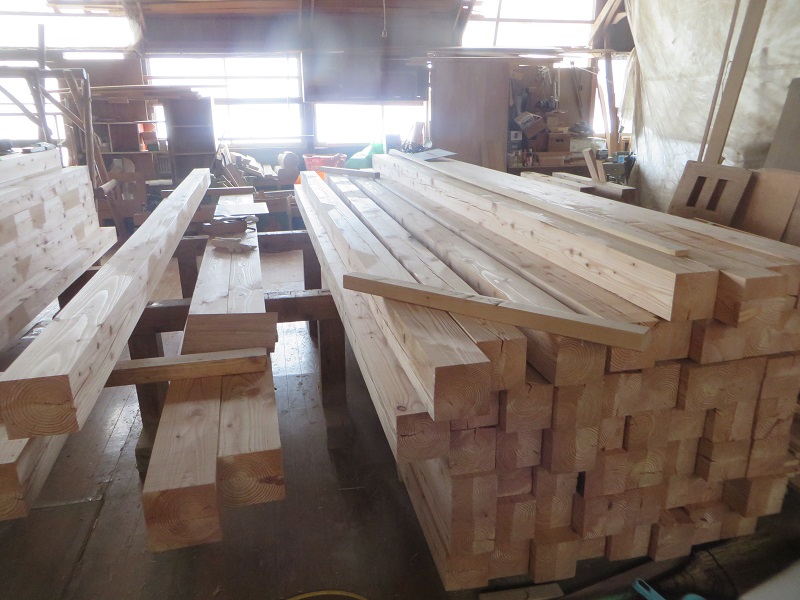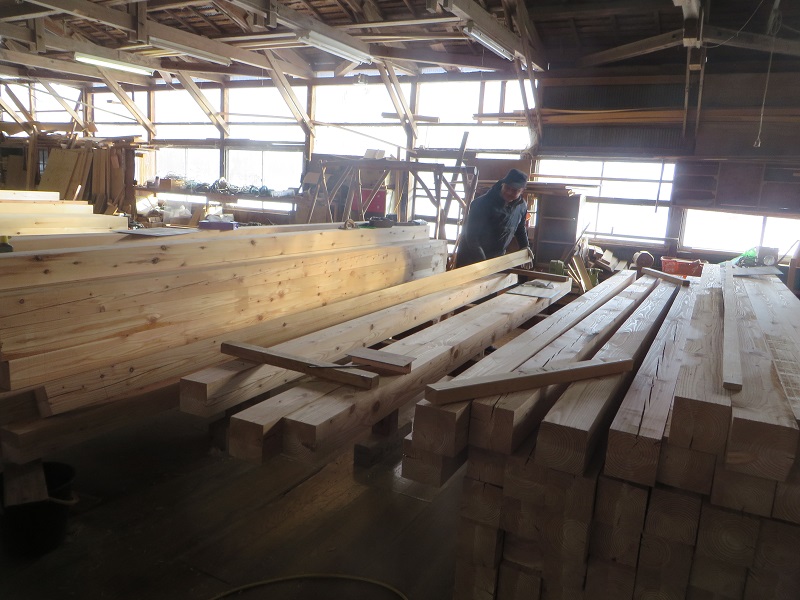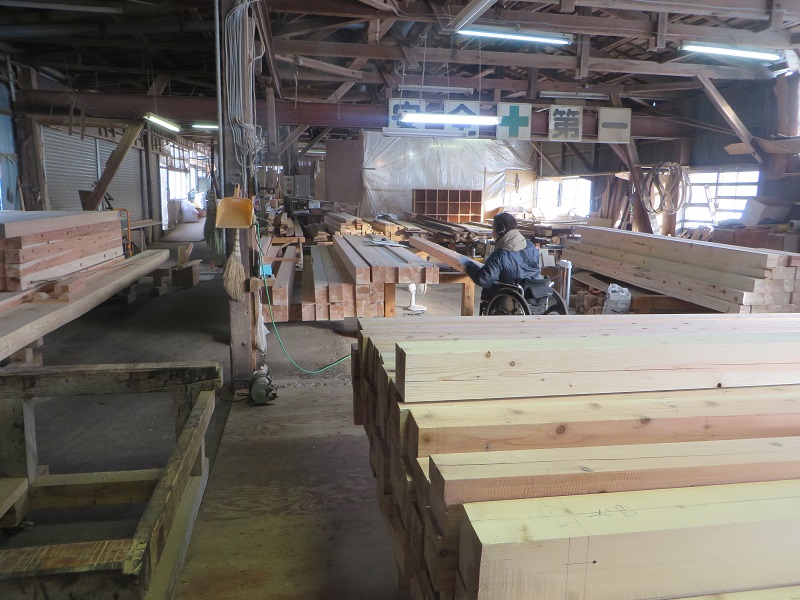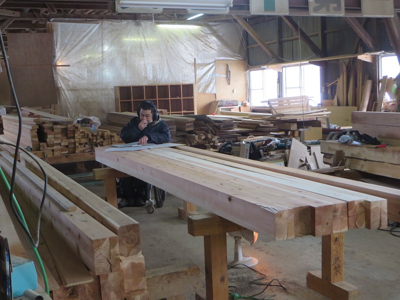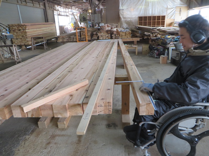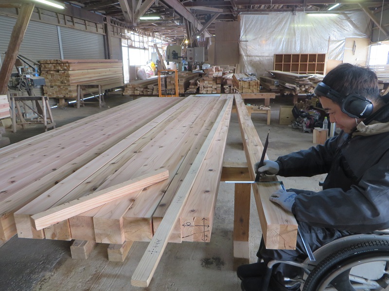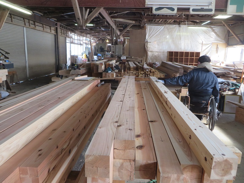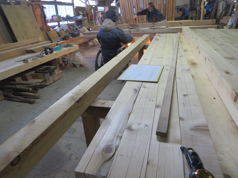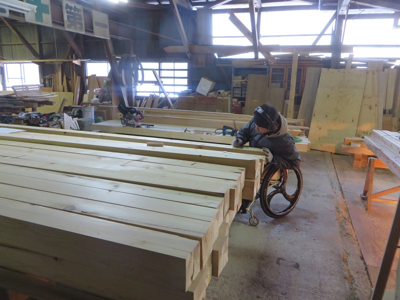最近の当社場内の仕事は車椅子大工だけではなく岩泉の古民家改修現場の小屋組み材の墨付けも取り組まれています。なので、積み置かれた木材の数が膨大です。