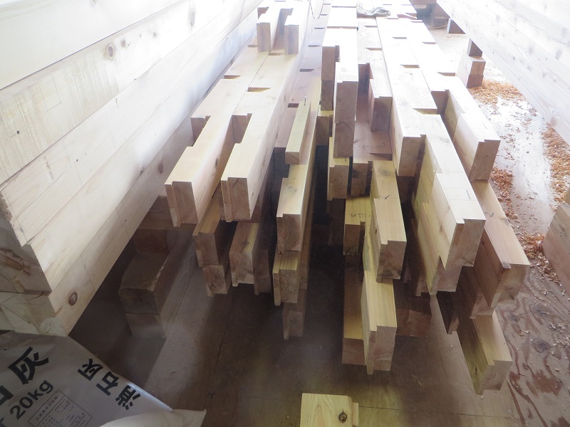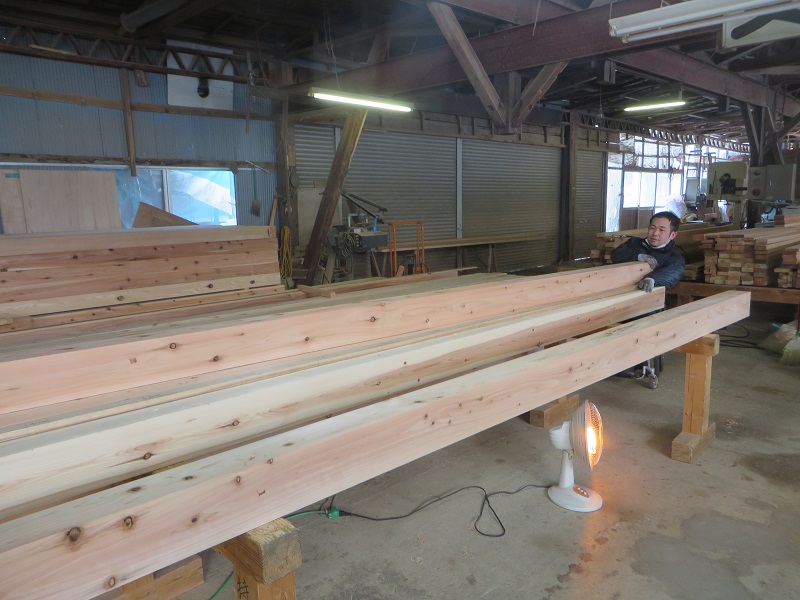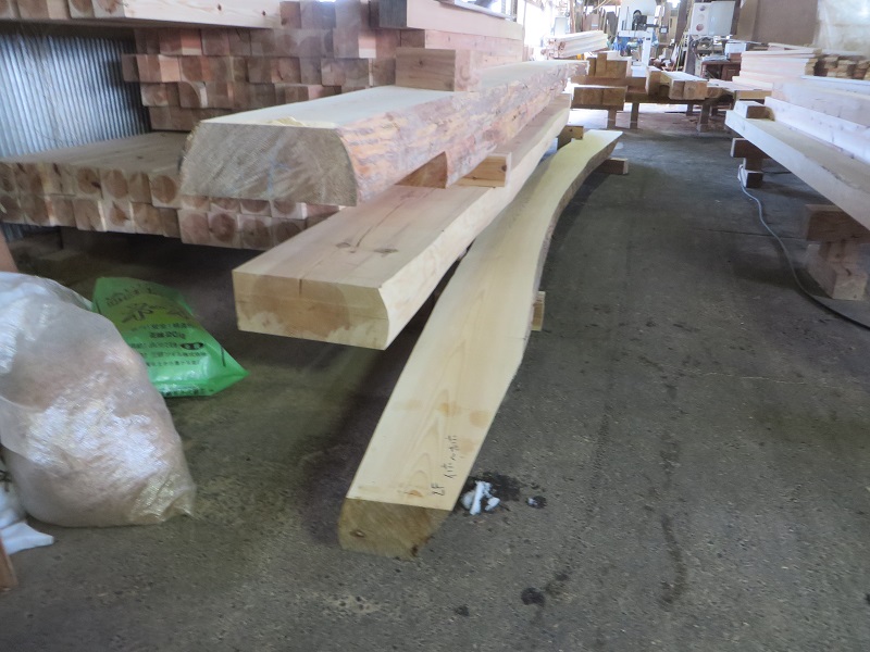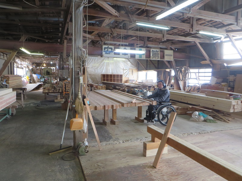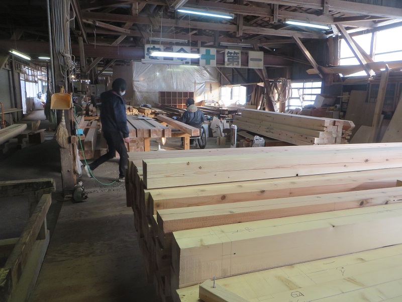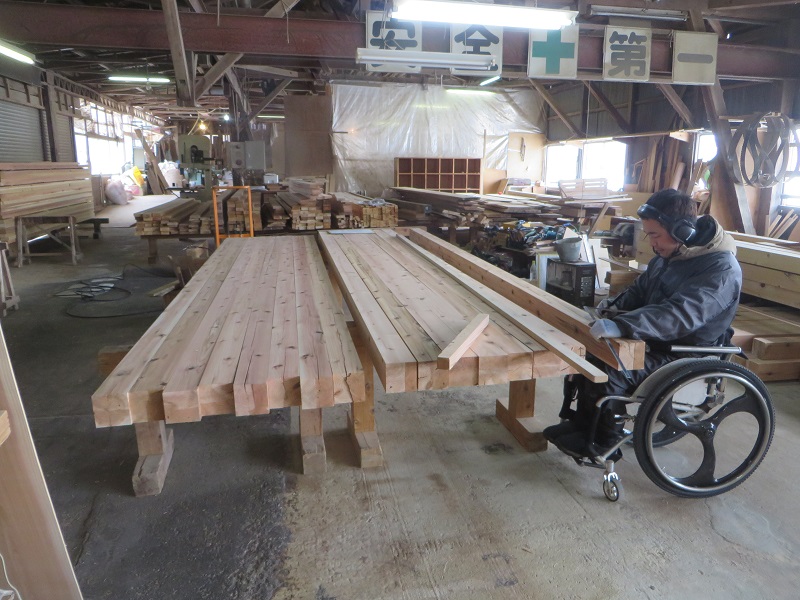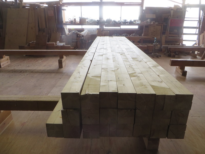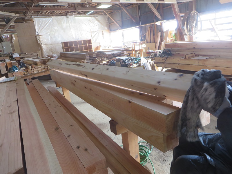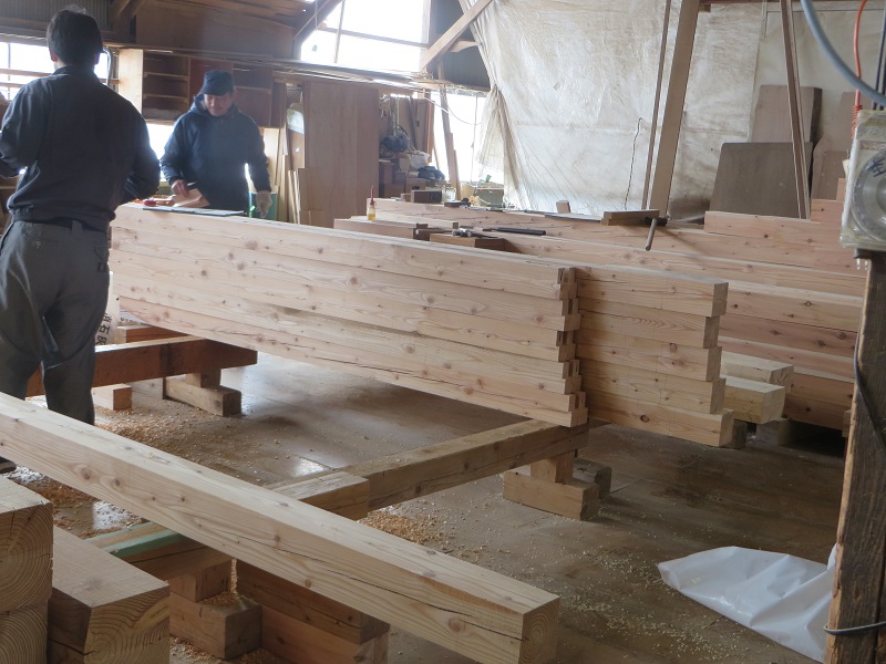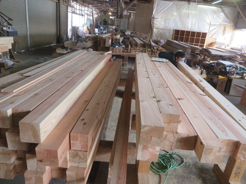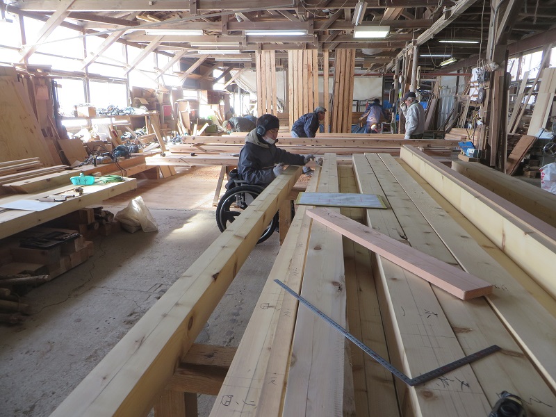 最近の当社場内の仕事は車椅子大工だけではなく岩泉の古民家改修現場の小屋組み材の墨付けも取り組まれています。なので、積み置かれた木材の数が膨大です。