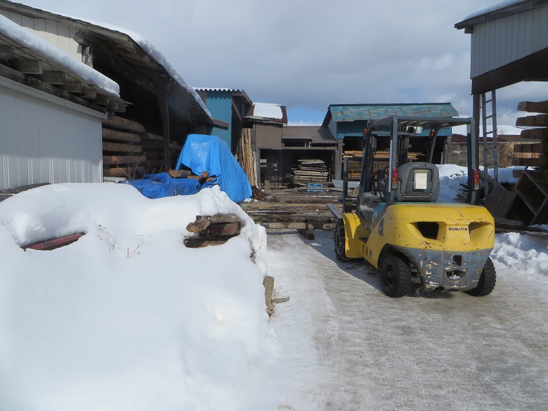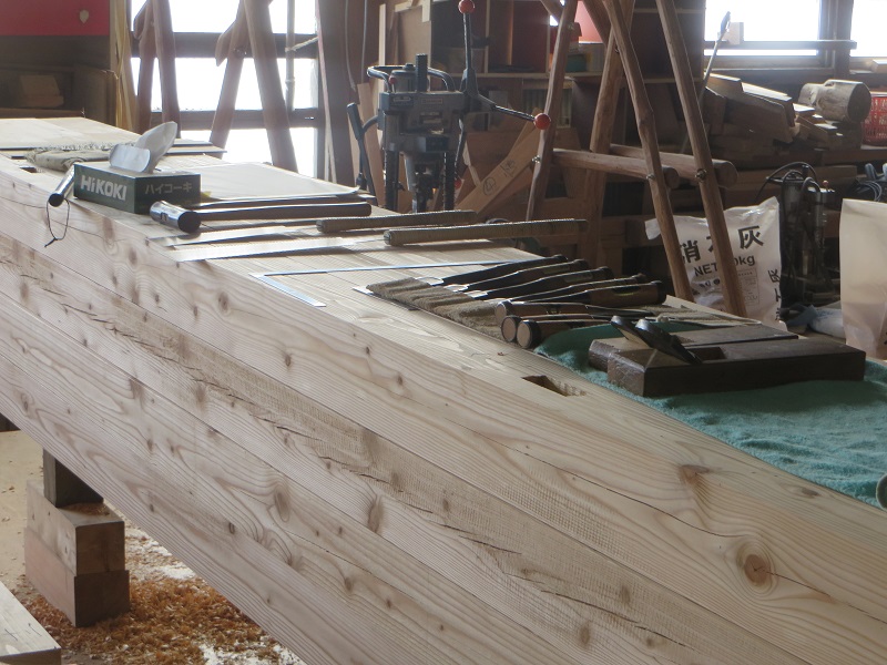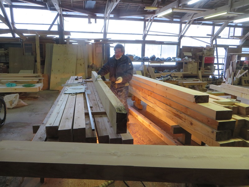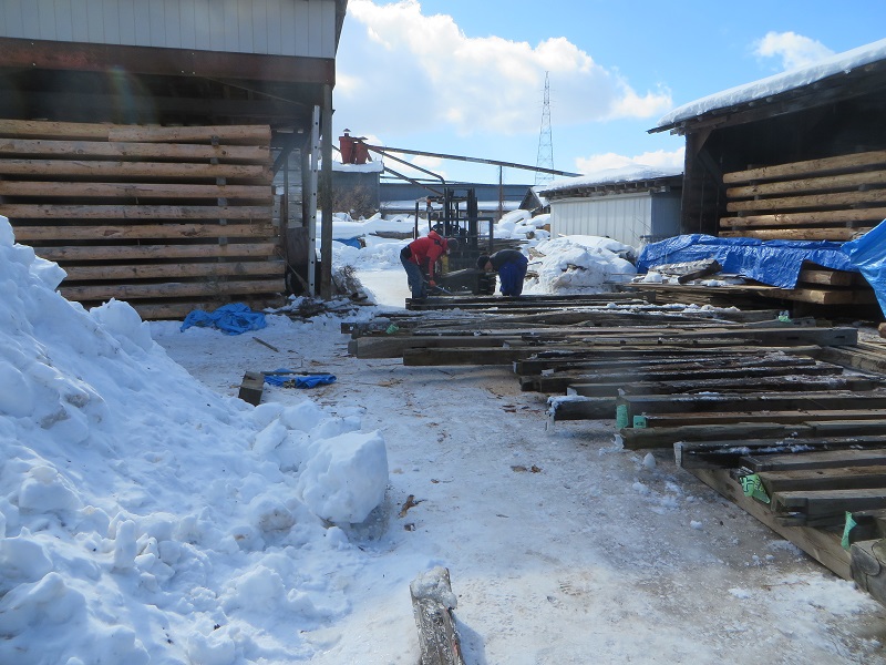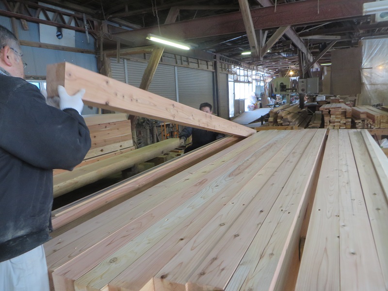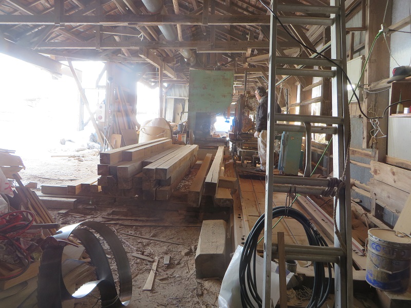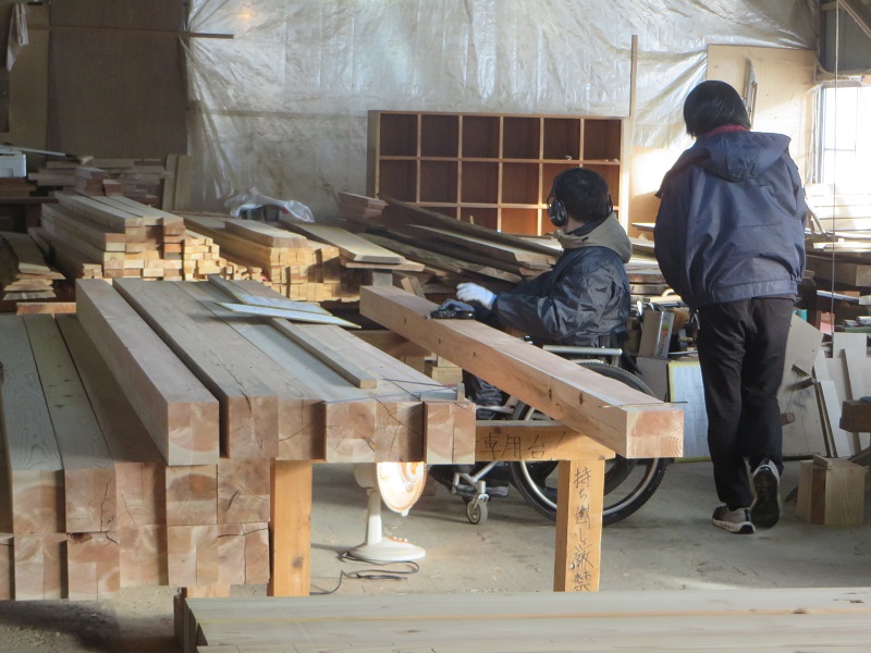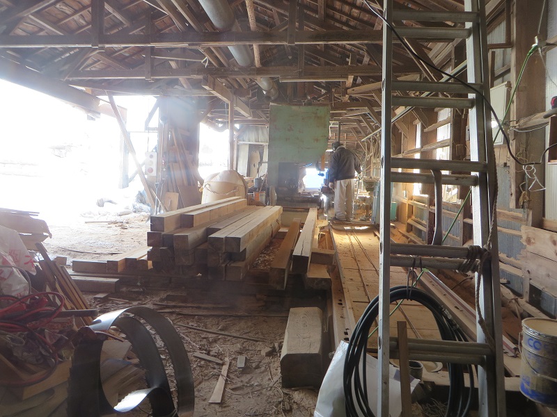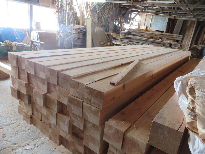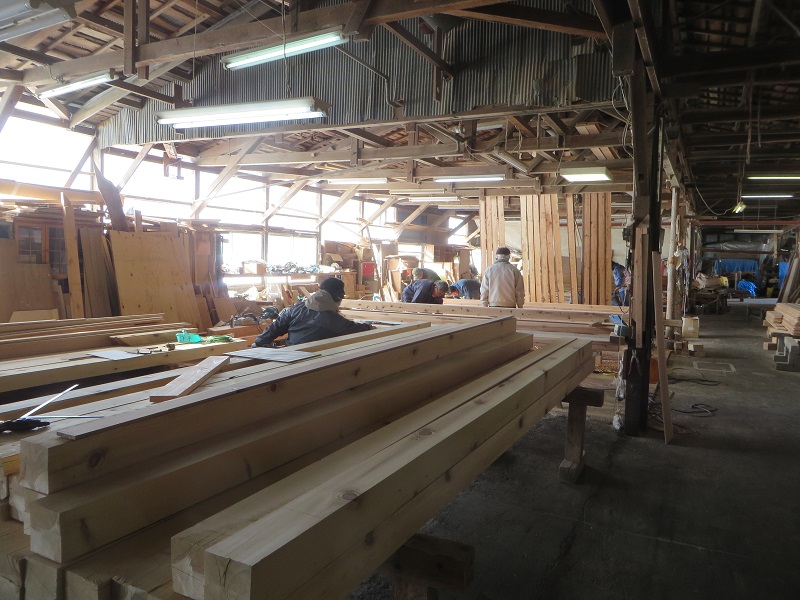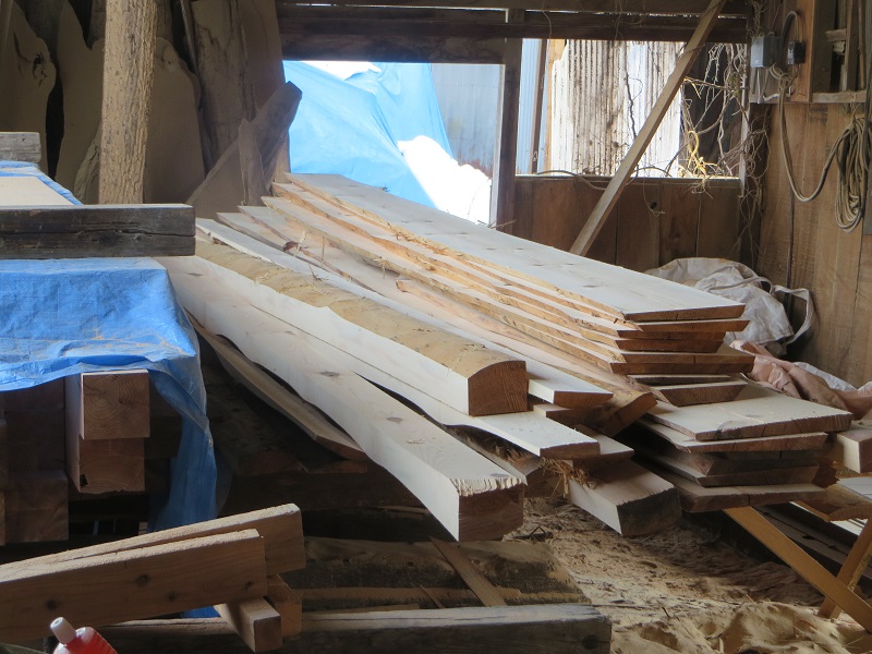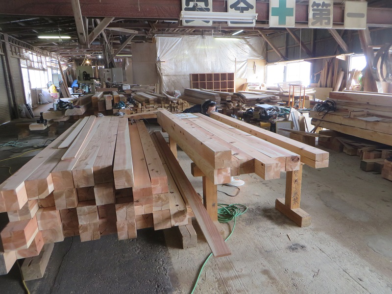 最近の当社場内の仕事は車椅子大工だけではなく岩泉の古民家改修現場の小屋組み材の墨付けも取り組まれています。なので、積み置かれた木材の数が膨大です。