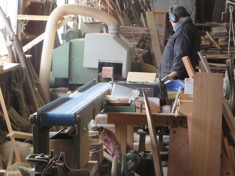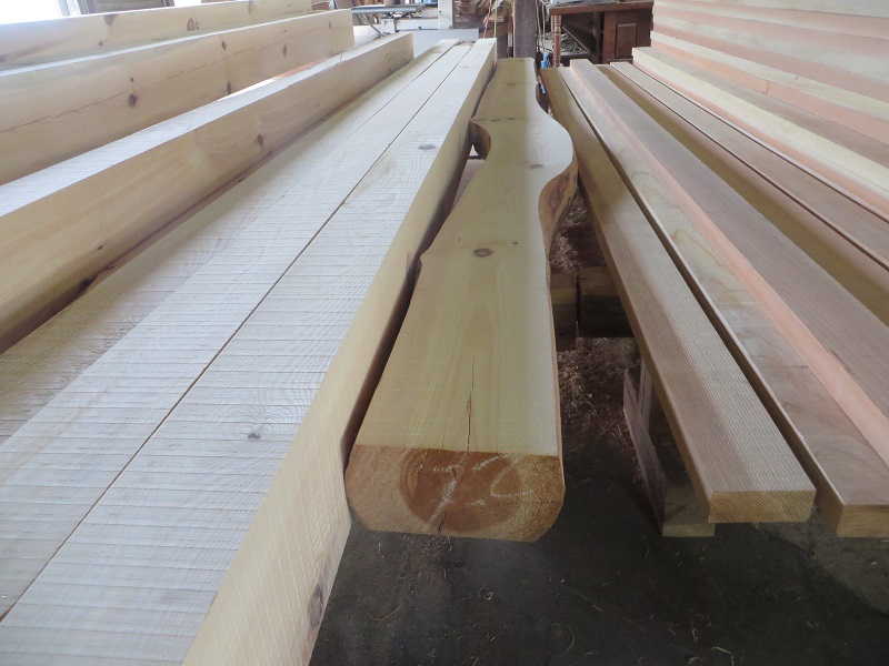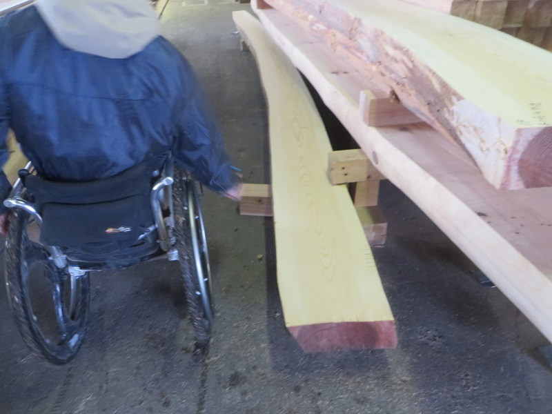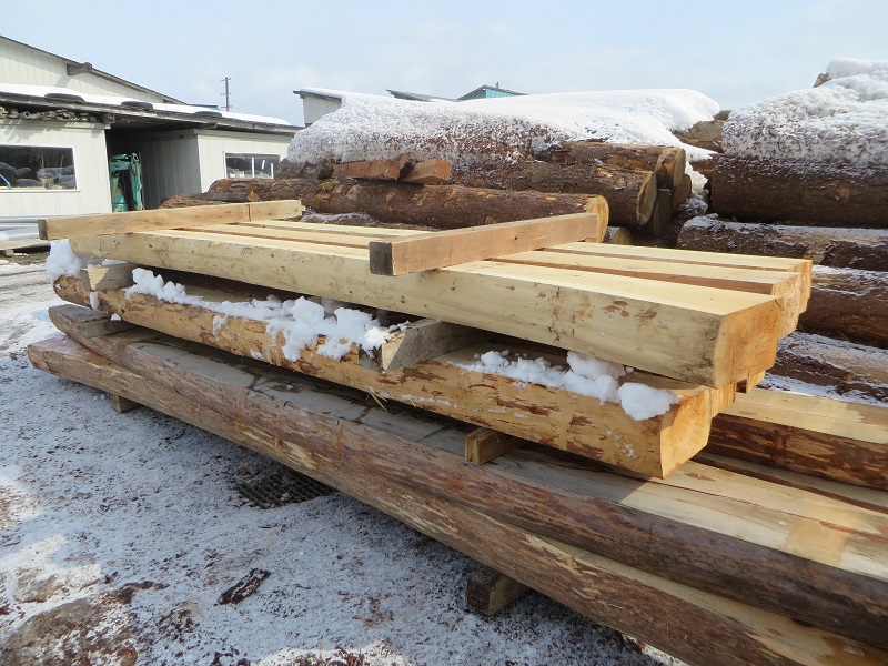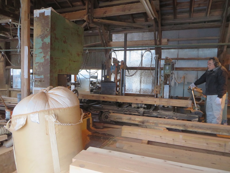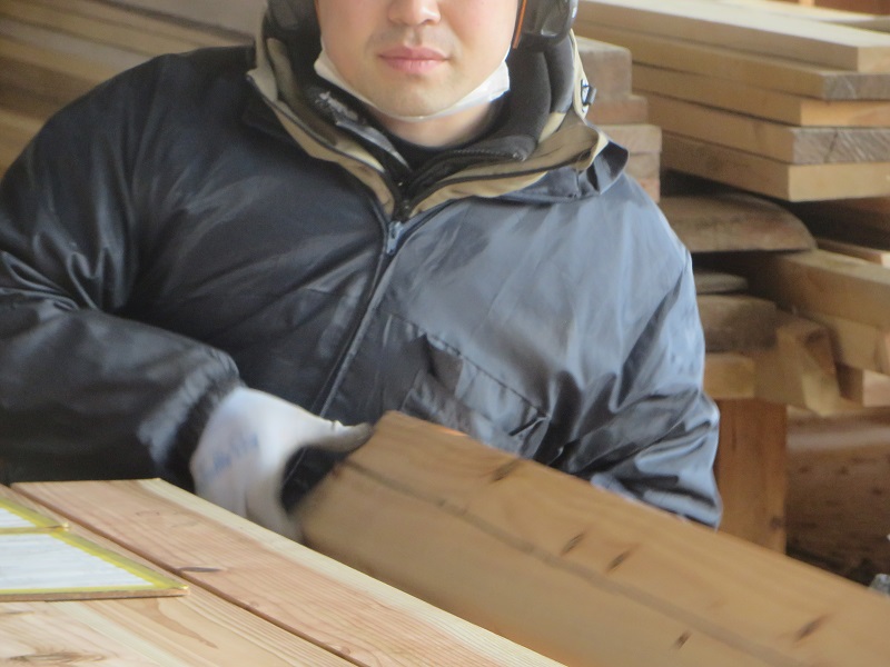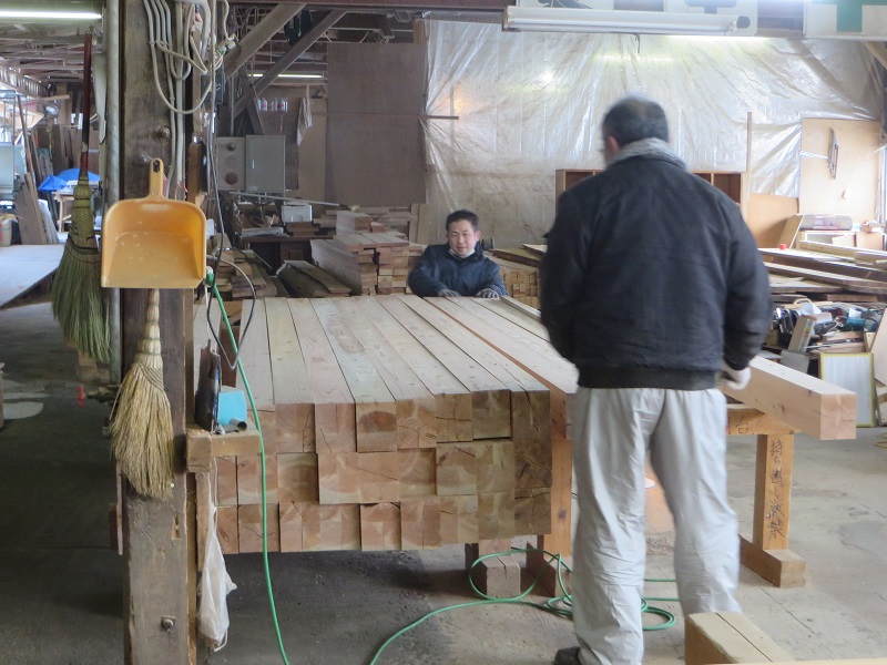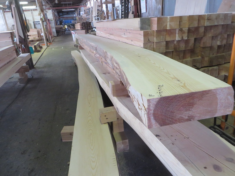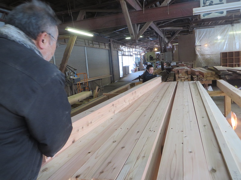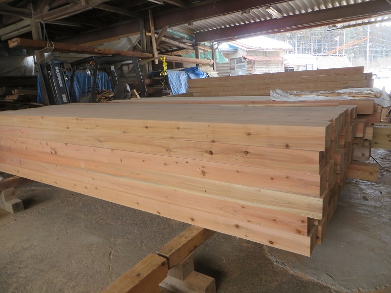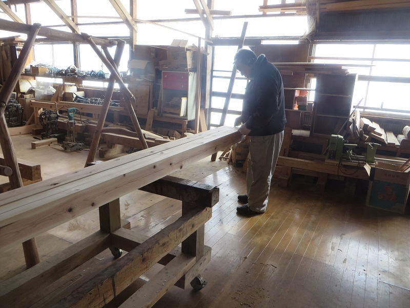最近の当社場内の仕事は車椅子大工だけではなく岩泉の古民家改修現場の小屋組み材の墨付けも取り組まれています。なので、積み置かれた木材の数が膨大です。