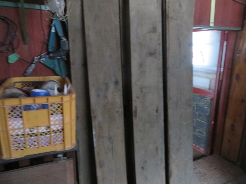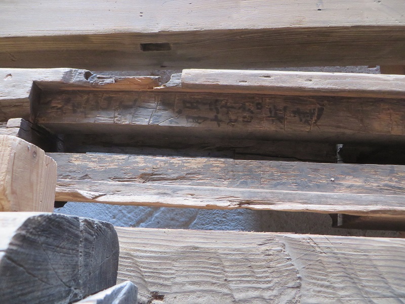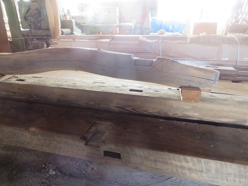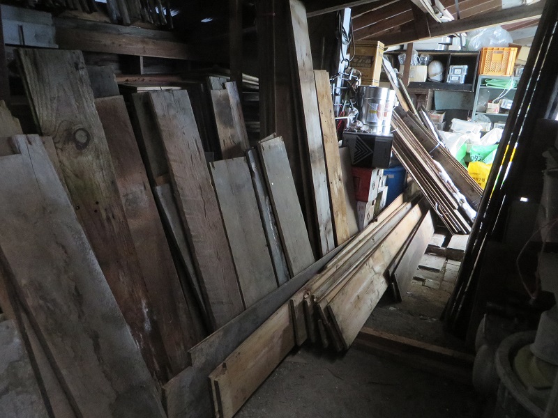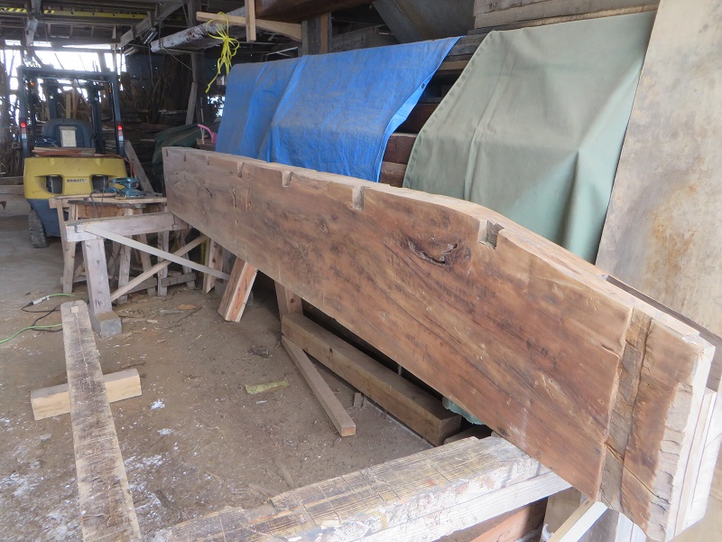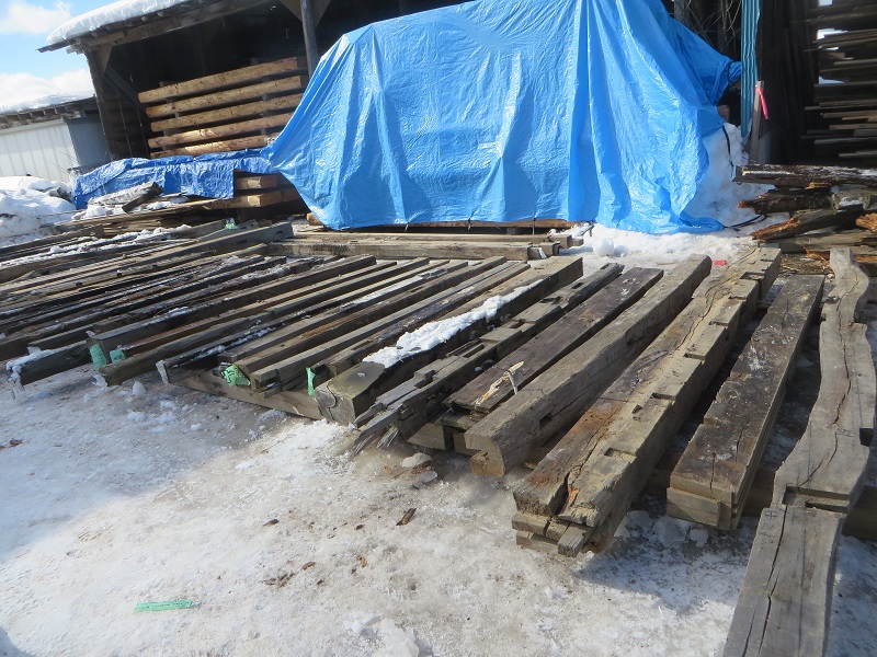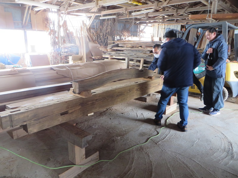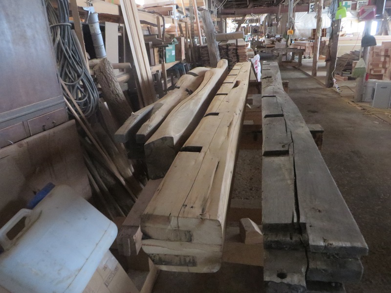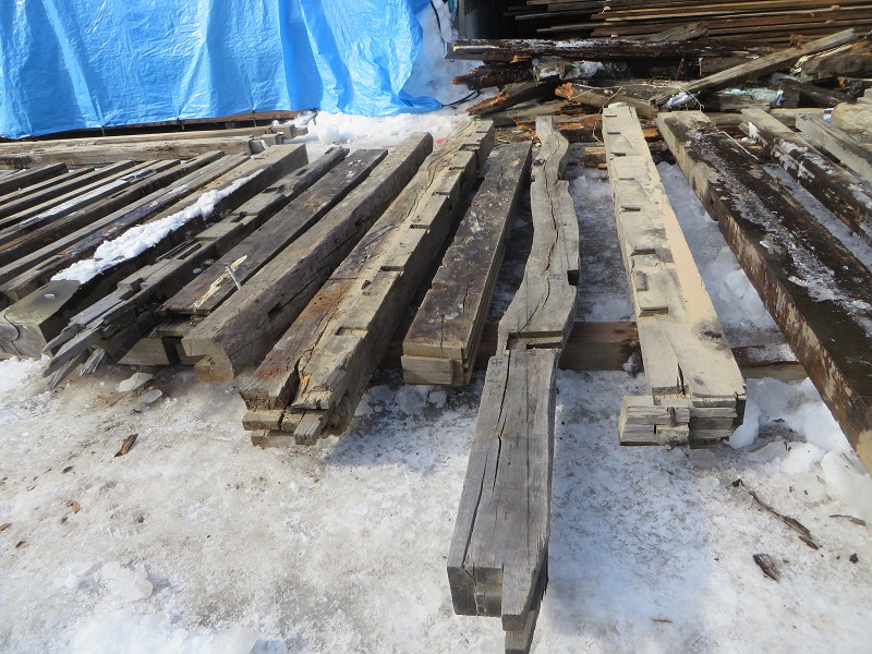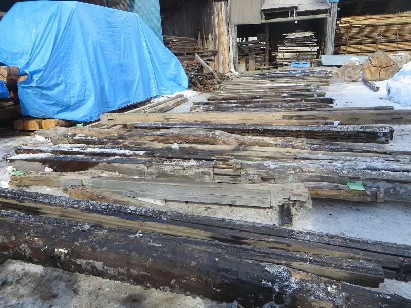 古材を並べて使用可能材の選別をしています。ひと昔にはこの様な曲がり材を上手く扱う技術が存在していた証拠品です。