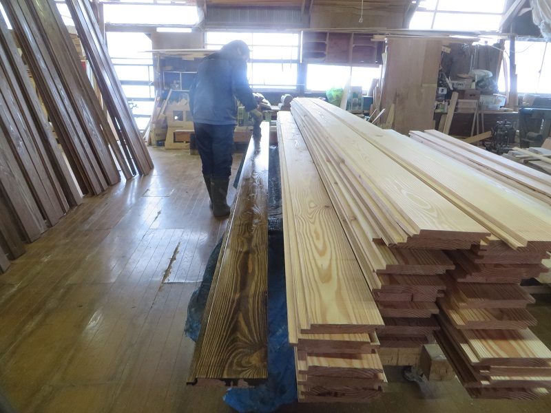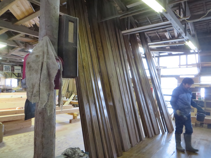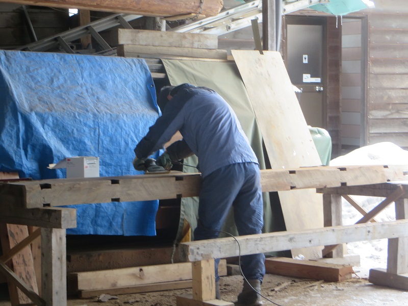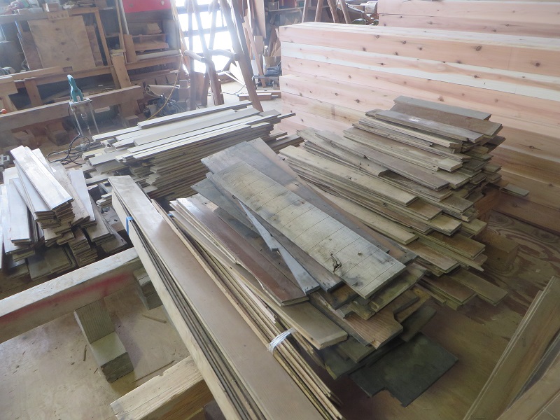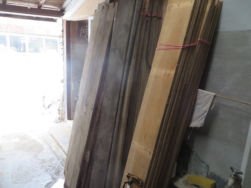 場内に保管してあった古材の柱や梁に無垢床材などを補修再生作業を行っています。自然の木は本当に生き物だと思います。手を掛けると掛けたぶん本当に良く変わります。