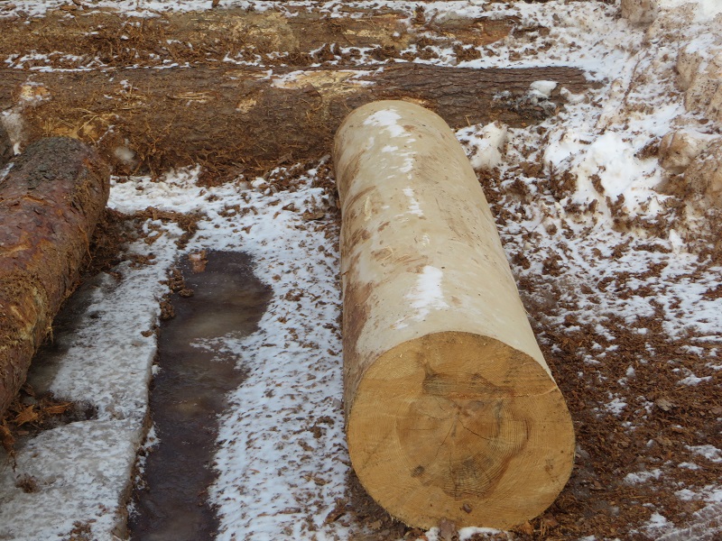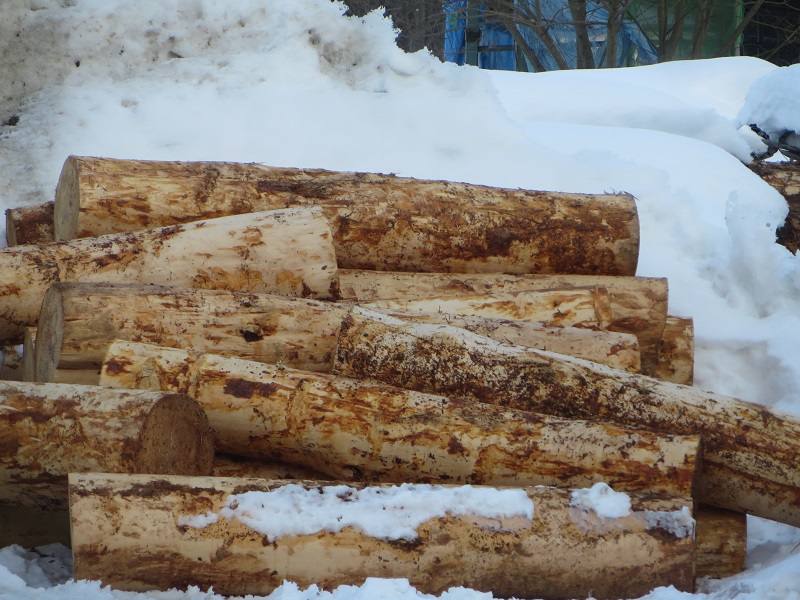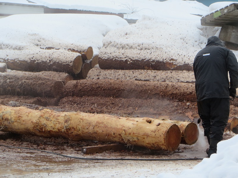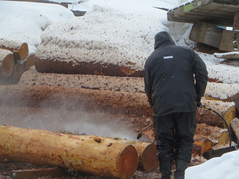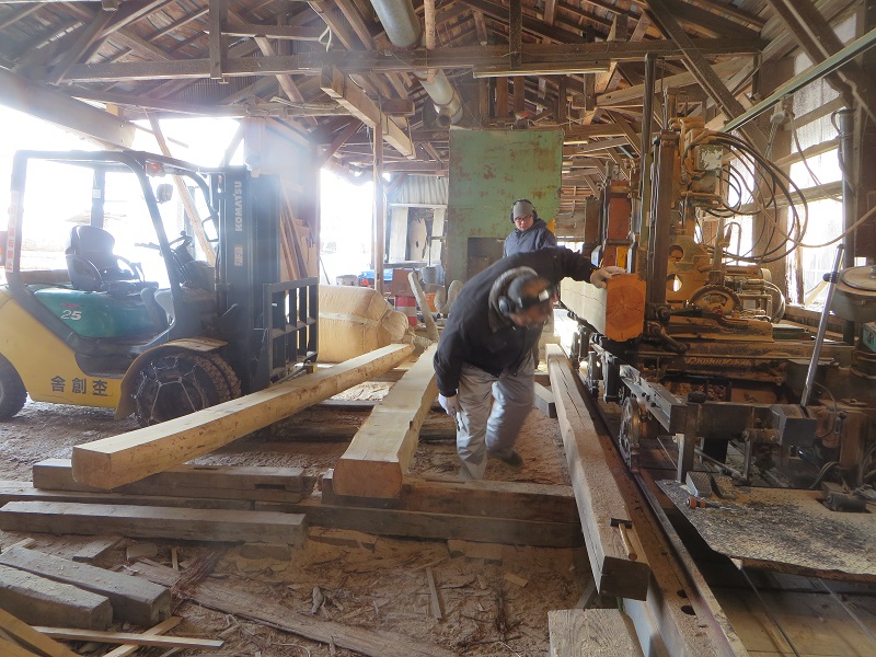 木材を自然乾燥させると、必ず反りや干割れが発生するので、構造材として使える様に修正挽を行います。これが工務店が製材機を所有するメリットでもあると云えます。そして、赤松の丸太の皮剥きも始めています。