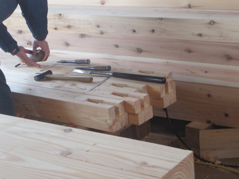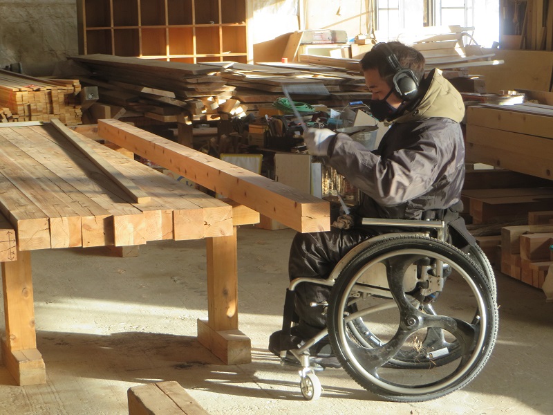 車椅子大工が一人黙々と墨付けしているところを見に行くと、柱の移動を一人でテコの原理を利用して車椅子に乗りながらこなしていました。もう少し良い瞬間で写したかったところではありますが、作業が手早くて遅れを取った写真です。
