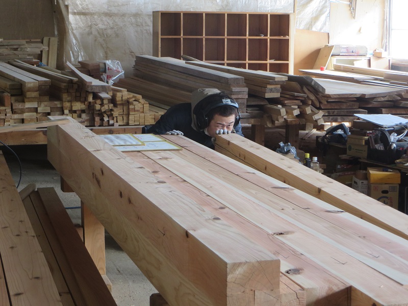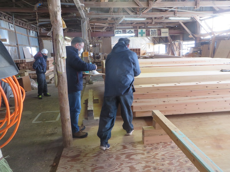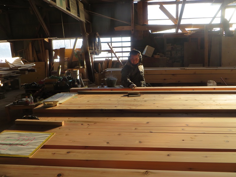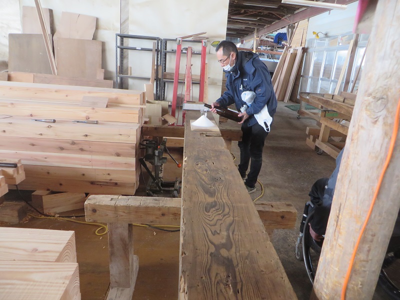 車椅子大工は、春から始まる北上の新築工事の土台墨付けを開始しています。この冬のうちに構造材の手刻みを終えて準備しておく為の取り組みです。場内では、その横で大改修現場の構造材の手刻みや新築住宅の外壁塗装なども同時に進められていました。
