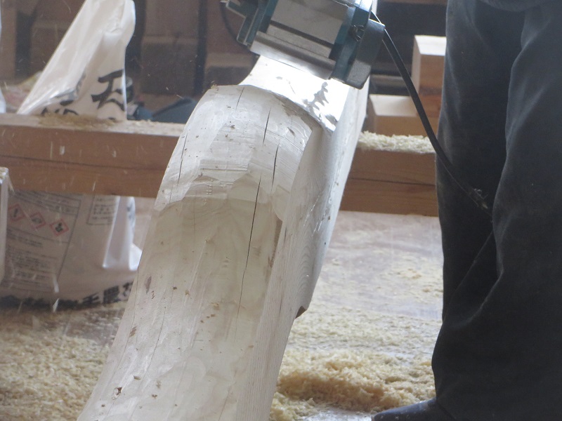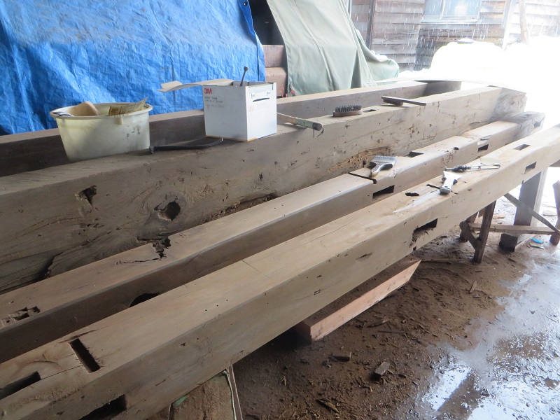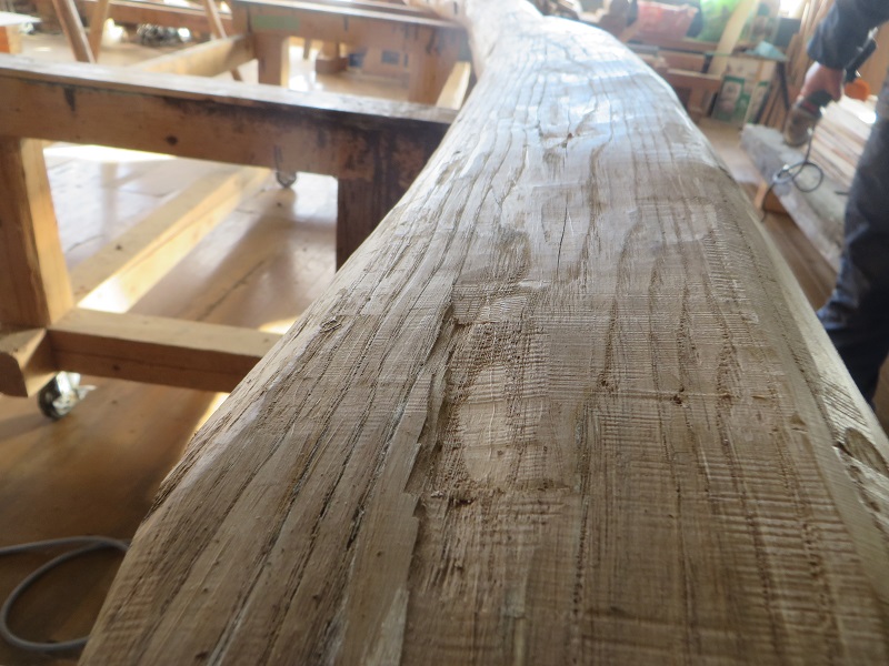 先週の作業場では、古材の再生修繕作業が多く見られました。それと共に丸太の皮剥きも順調に進んでいました。