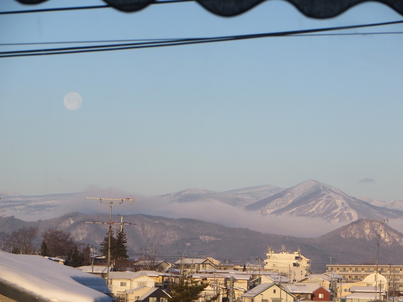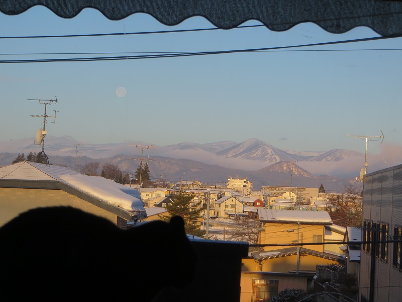 今朝の自宅から眺めた西の山は朝日に染まりながら白くくっきりと輪郭を露わにしながら沈む満月を惹きたてていました。